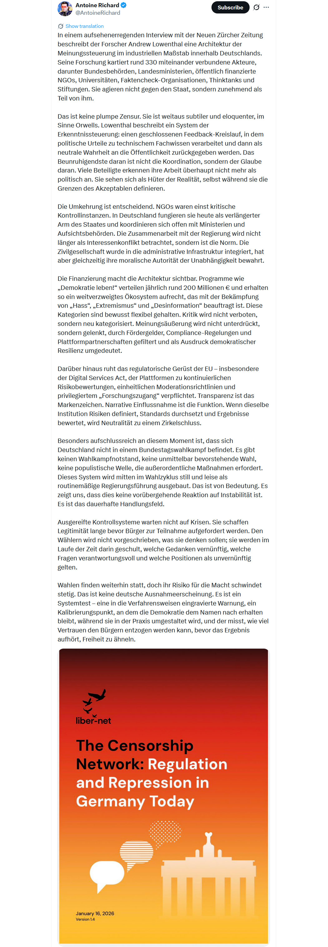 Dank an Daniel Matissek, dass er sich die Mühe gemacht hat, die vielen Dokumente der EU Censorship Files des House Judiciary GOP so verständlich zusammenzufassen.
