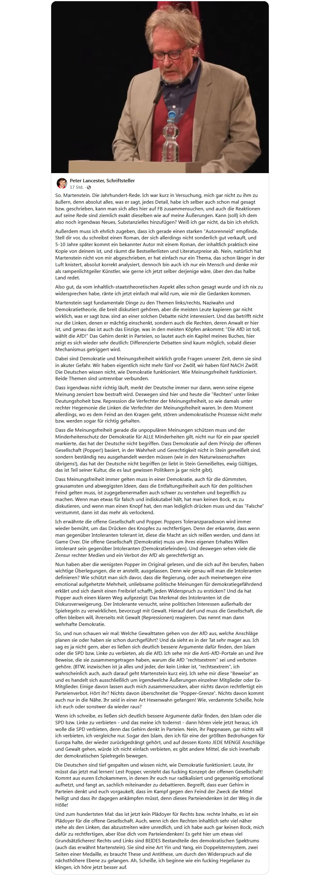 Friedrich aus dem kleinen Sauerland, der sich so sehr nach großer, weltweiter Bedeutung sehnt, wollte wohl mal wieder die Bühne nutzen und ein wenig Glanz erheischen, und so hielt er denn - in seinen Augen - eine "große Freiheitsrede", in der er voller Stolz erklärt, dass die Meinungsfreiheit in Europa Grenzen habe!