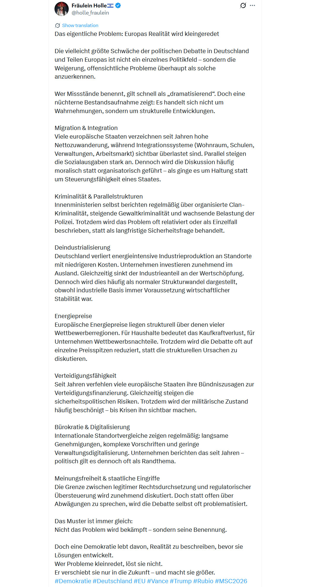 Eine großartige, intelligente Rede von @SecRubio in München! Nur leider werden sie die europäischen Verantwortlichen in ihrer Ignoranz und Selbstgefälligkeit nicht verstehen, denn sie sind rrrrrretarded.