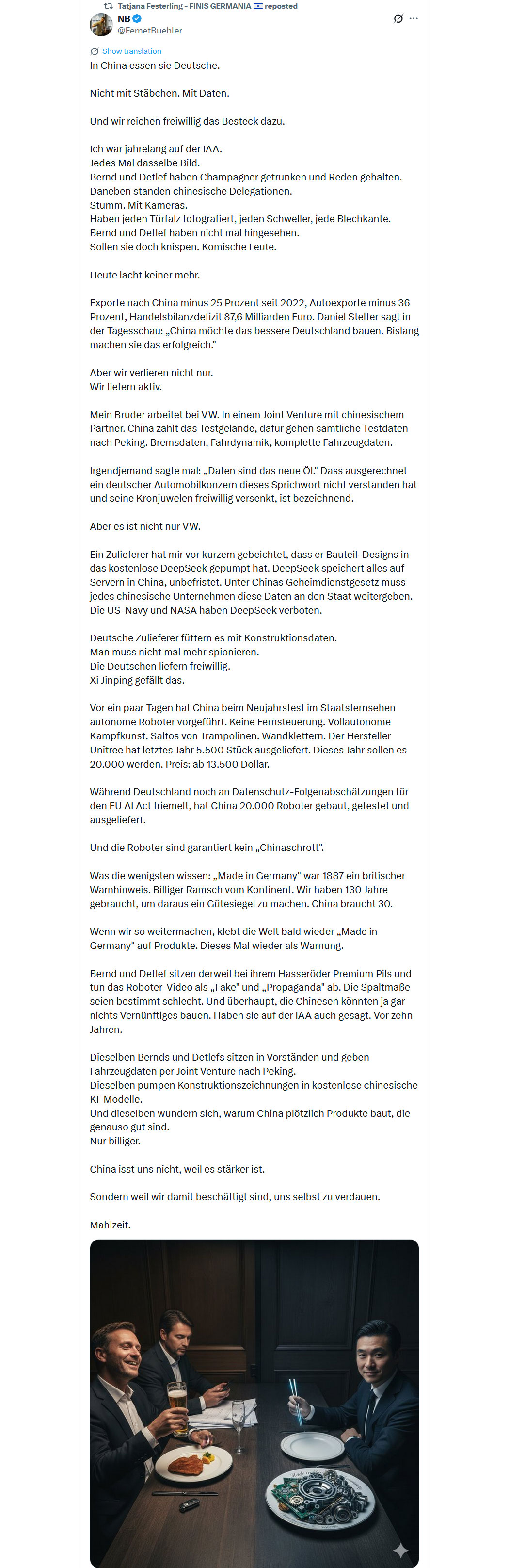 Und jetzt fragen wir uns bitte alle, warum die Chinesen ihre Superwaffe "Tiktok" auf den Westen gerichtet haben: Sie zerstören den Westen, indem sie die Zukunft, die Kinder, systematisch verblöden und in die Dopamin-Abhängigkeit führen. Das ist Kriegsführung nach Sun Tzu - den hätte man lesen, kapieren und entsprechende Abwehrmechanismen entwickeln müssen.