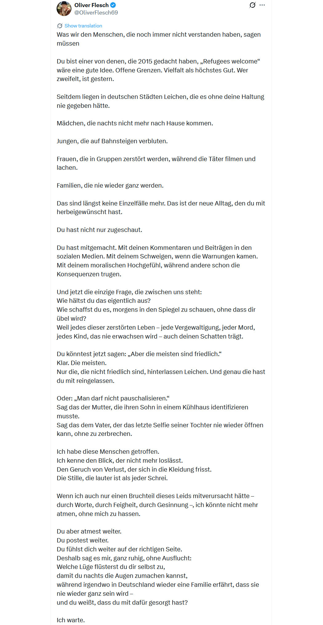 Sehr gut beschrieben. Aber wo Hybris, selbstgerechte Moralhoheit und Narzissmus vorherrschen, wird nicht reflektiert, sondern nur abgewehrt. So wie eine Justiz-Vertreterin auf offener Bühne mal eben verächtlich eine BKA-Statistik vom Tisch wischt. Es wird nie Einsicht oder Mitgefühl geben, sondern nur Verdrängung - das Programm läuft ja schon seit über 10 Jahren, ist geistig voll implementiert und wird an die Brut weitergegeben. Auch in der bevorstehenden Sharia-Gesellschaft wird es keine Einsicht geben, die werden alle zum Islam konvertieren, um die Scham über das eigene Versagen zu vermeiden.