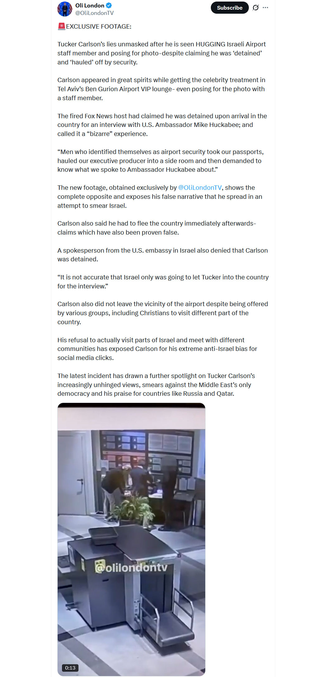 Qatarlson hat alle Einladungen von Israelis abgelehnt, die ihm gerne ihr Land gezeigt hätten. Der gesamte Besuch diente nur dazu, diesen angeblichen "Skandal" am Flughafen zu produzieren und damit seine antisemitischen Follower bei der Stange zu halten und den Hass auf Israel weiter zu befeuern.