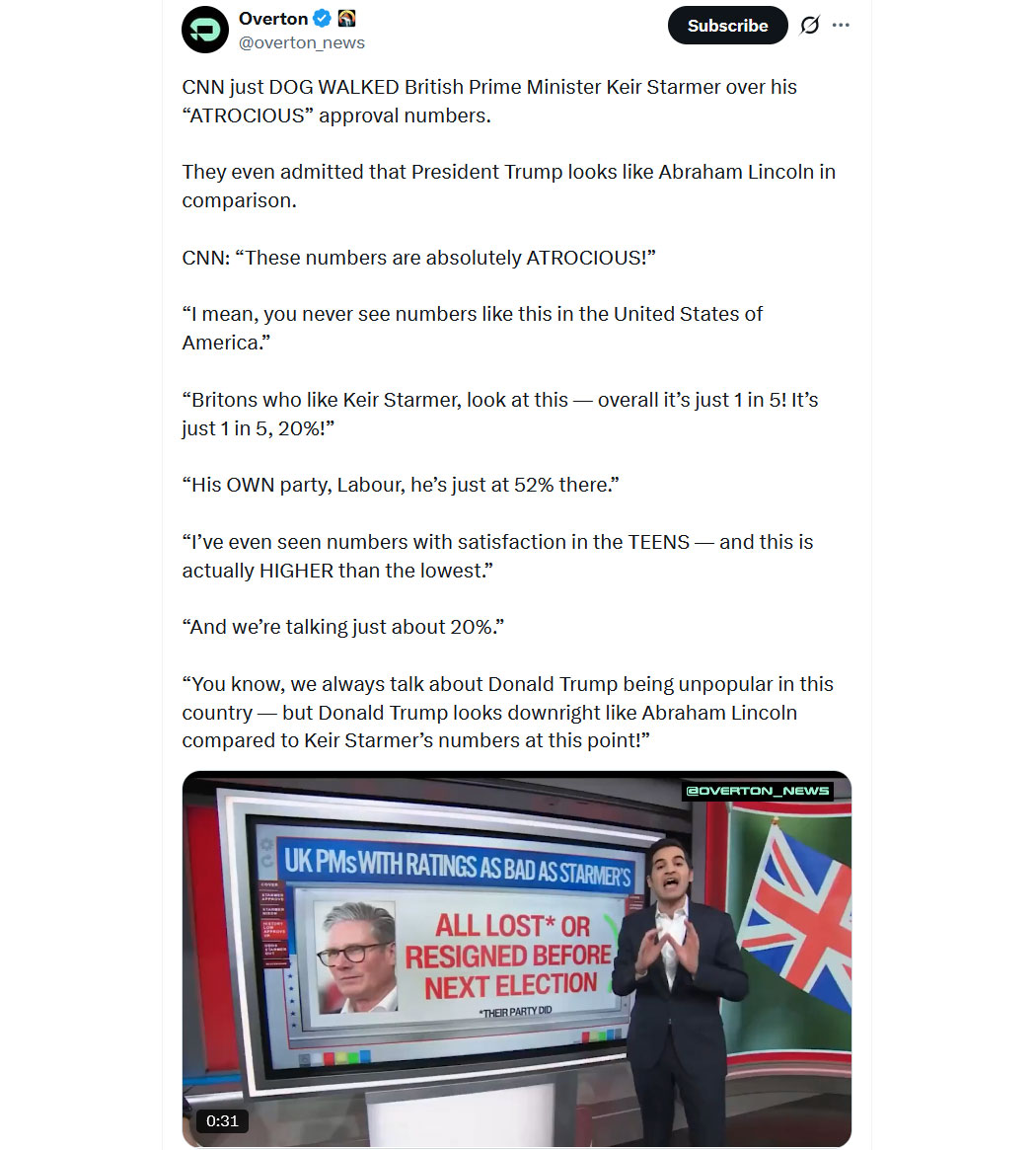 Sogar der linke Sender CNN lacht sich inzwischen über den Islam-Appeaser und Ukraine-Kriegstreiber Starmer schlapp. Haben die schon die Zustimmungswerte des großen Kanzlers aus dem Sauerland gesehen? 😂