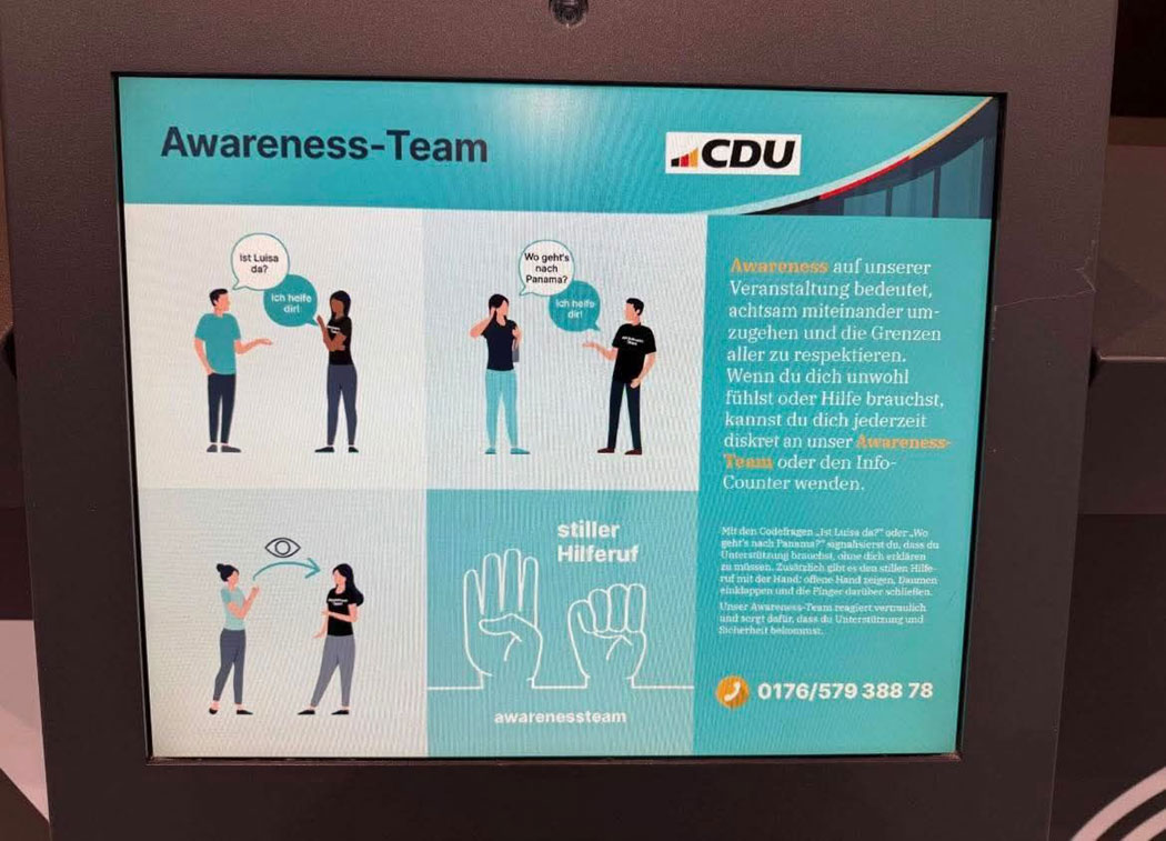 Wer sich durch meine sexualisierte Wortwahl bedroht fühlt, kann schnell die Faust-Geste machen und Zuflucht beim Awareness-Team der CDU suchen.