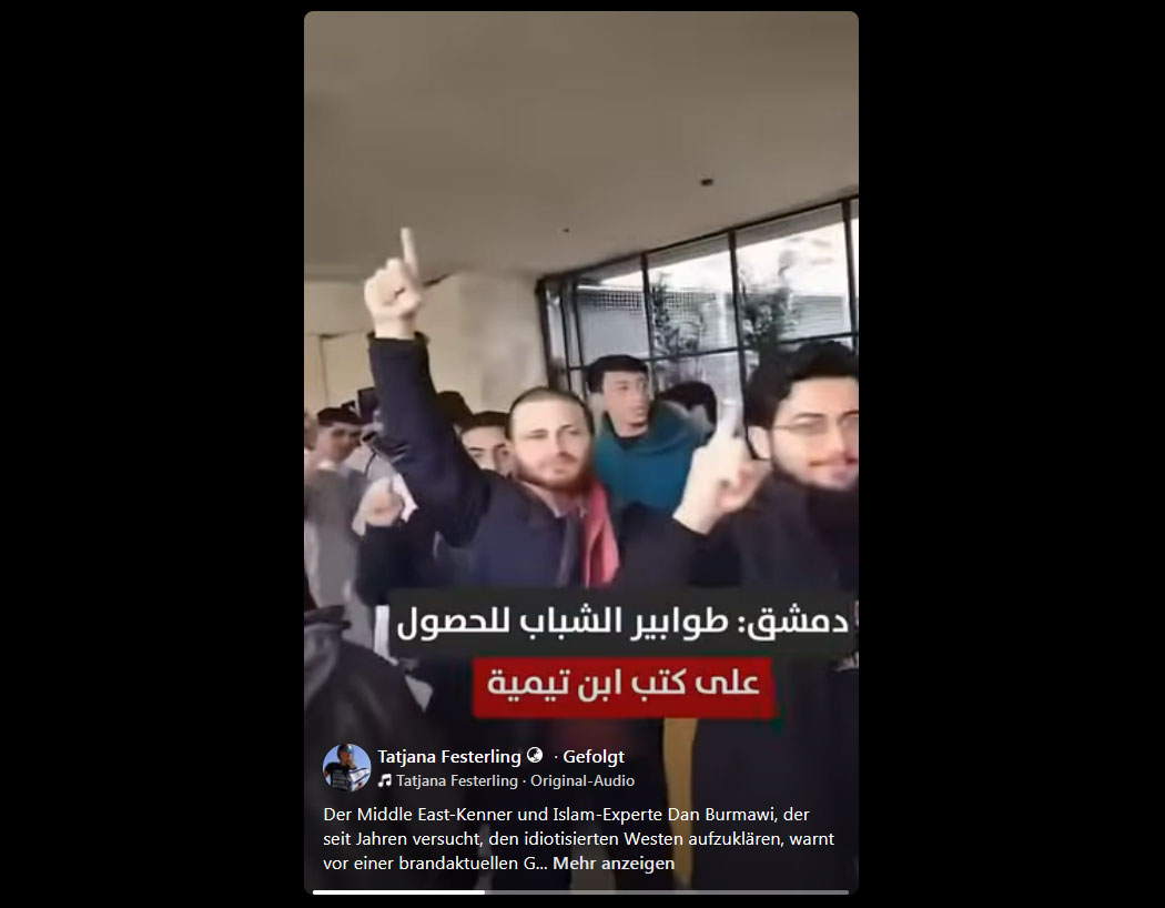 Das Video aus Damaskus zeigt Tausende junger Männer, die Schlange stehen, um kostenlose Exemplare von Ibn Taymiyyas Büchern zu erhalten.