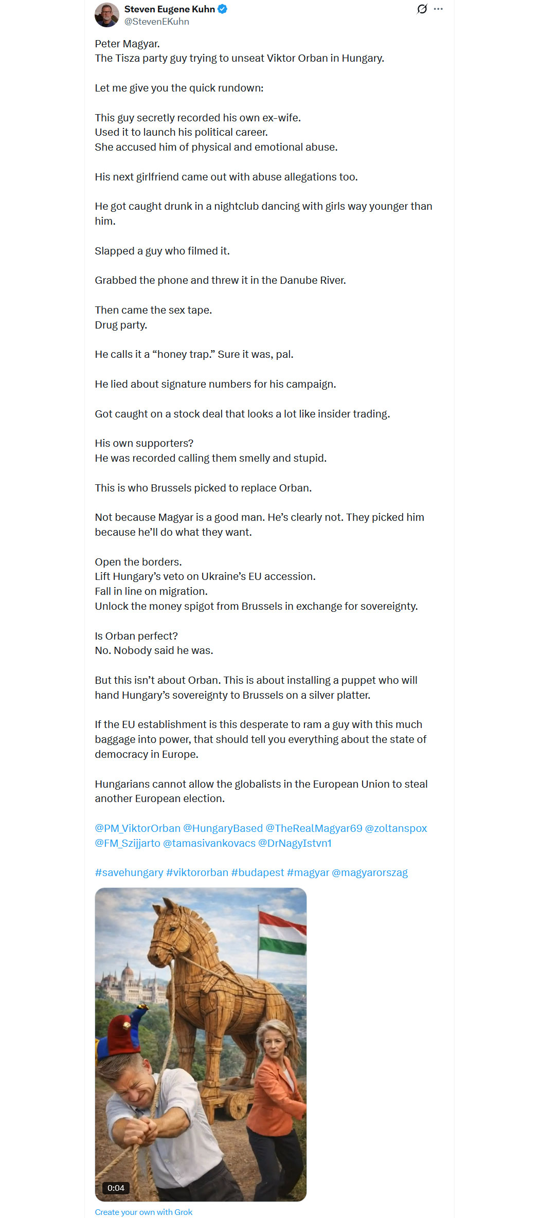 Jetzt, wo die Weltöffentlichkeit sieht, dass sich Europa unter der Knute einer von Macht besessenen Bande in Brüssel in ein runtergerocktes, verarmendes, islamisiertes, totalitäres Shithole mit täglicher Gewalt auf den Straßen verwandelt hat, bleibt zumindest zu hoffen, dass sie die anstehenden Wahlen in Ungarn und Bulgarien nicht mehr ganz so offensichtlich beeinflussen können.