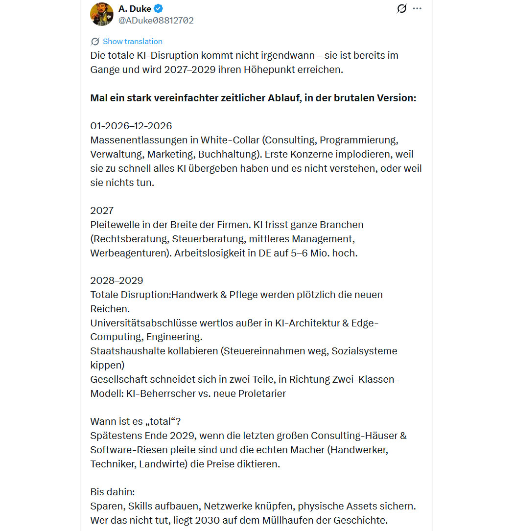 Jupp, noch laufen KI-Anwendungen leise an und man kann so tun, als seien sie sowas wie eine Subkultur irgendwelcher Nerds und Freaks. Für fortschrittlich hält sich ja schon, wer ChatGPT nutzt wie Google - typisch für Hybris-Land. Die Geschwindigkeit, in der sich AI-Agenten inzwischen selber und gegenseitig entwickeln und perfektionieren ist überwältigend. Dagegen steht die lustlose, fokus-unfähige, dopamin-süchtige und leider in großen Teilen völlig verblödete GenZ - die nichts mehr auf die Reihe kriegt, außer Grün zu wählen. Natürlich wird deren Minderleistung durch automatisierte, intelligente Rechenleistung ersetzt werden müssen. Was denn sonst?