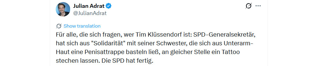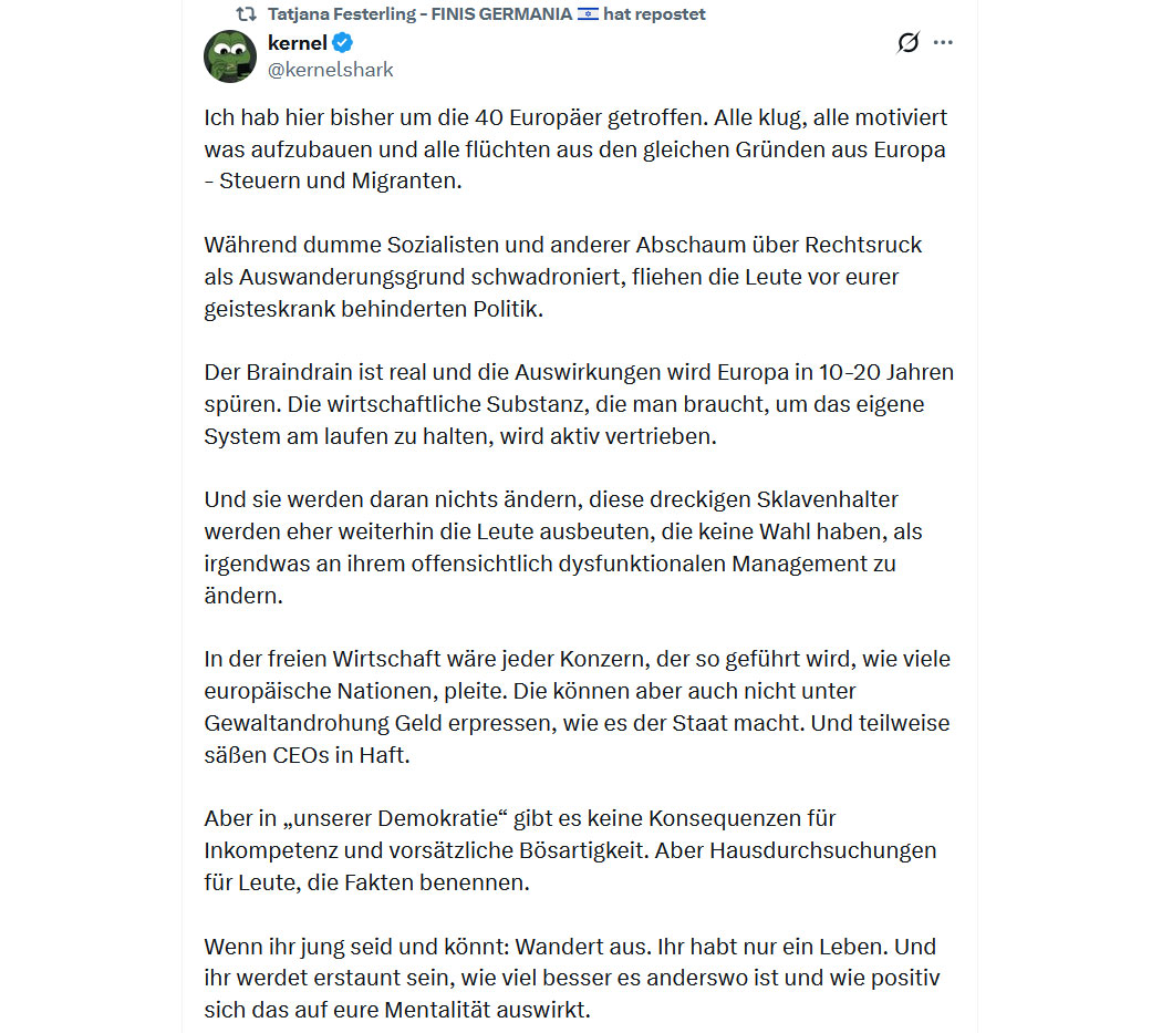 Ich bin erschüttert darüber wie dermaßen dumm, dreist, narzisstisch und triggerbar das rechte Spektrum in Deutschland ist. Hilfe, ist das schrecklich! Man kann denen, die über Intelligenz und klaren Verstand verfügen, nur raten, schnellstens das Weite zu suchen.