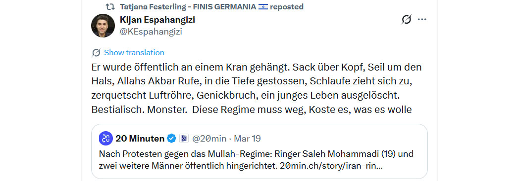 Es bricht einem das Herz. Und dann kommt wieder die Wut, weil sich der deutsche Mullah-Fanclub ja längst nicht nur auf die Ex-Mauermörder-Partei, die Grünen und die SPD beschränkt, sondern es auch im sogenannten konservativ-freiheitlichen Lager im Umfeld der AfD von Juden- und Israelhassern nur so wimmelt. Deutsche, die den Terror der Mullah-Schergen gegen blühende, junge Menschen im Iran entweder leugnen oder sogar irgendwie okay finden, weil sie als "Gegenleistung" für ihr widerliches Mullah-Appeasement noch drauf hoffen, dass die IRGC Israel auslöschen.