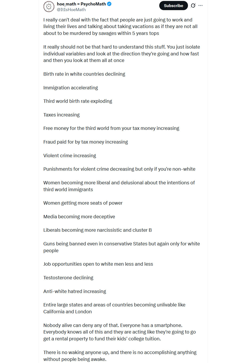 Ja, so geht's mir auch, schaut man auf die Gesamtlage, in West-Europa kommt ja noch die massive Energiekrise und die sich beschleunigende Deindustrialisierung hinzu, dann ist einem klar, dass die Menschen in einer so tief verankerten Leugnungs- und Abwehrhaltung stecken, dass nichts mehr aufgehalten werden kann. It's over.