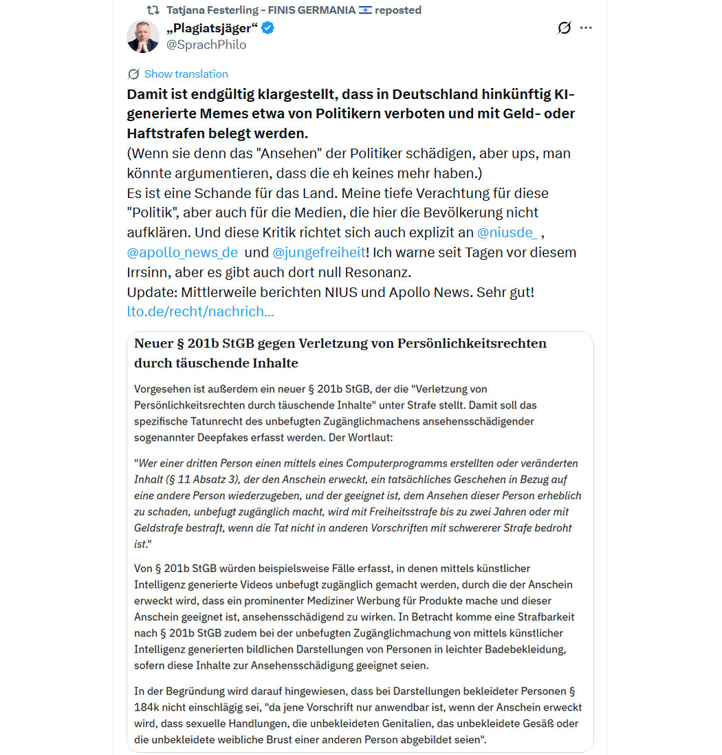 "Der geplante § 201b StGB (Verletzung von Persönlichkeitsrechten durch digitale Fälschung) soll als neuer Straftatbestand die Verbreitung von KI-generierten oder manipulierten Inhalten (Deepfakes) unter Strafe stellen, die das Ansehen einer Person erheblich verletzen. Er schließt Lücken bei gefälschten Videos, Bildern oder Tonaufnahmen, die echt wirken, mit bis zu fünf Jahren Freiheitsstrafe."