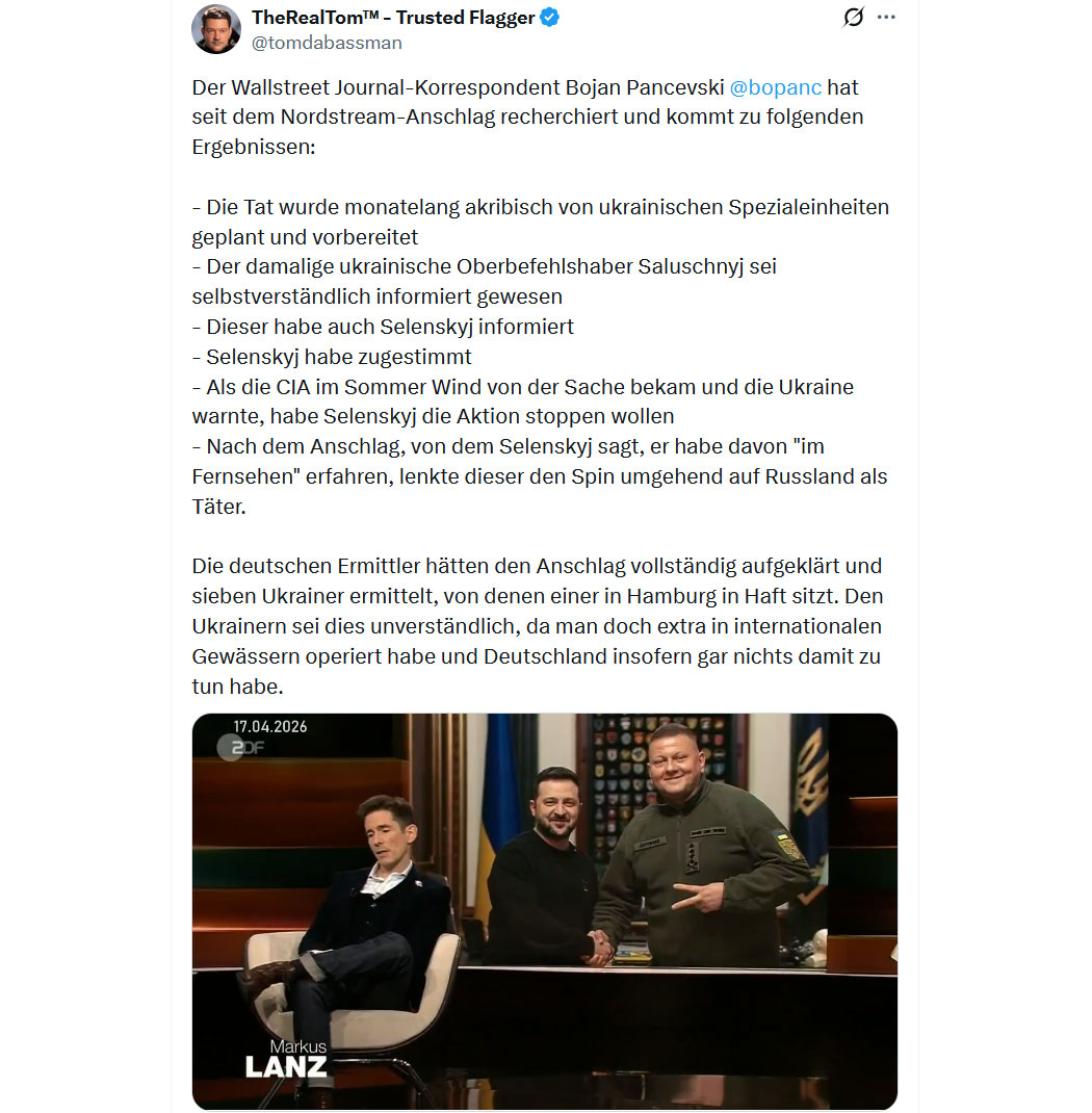 Ach, will Lanz jetzt etwa andeuten, der Russe habe doch nicht die eigene Pipeline Nordstream 2 in die Luft geblasen, sondern der Terroranschlag gegen die Energieversorgung Deutschlands wurde von den Ukrainern durchgeführt, für die die Deutschen täglich arbeiten gehen, um sie großzügig mit Milliarden zu stopfen?