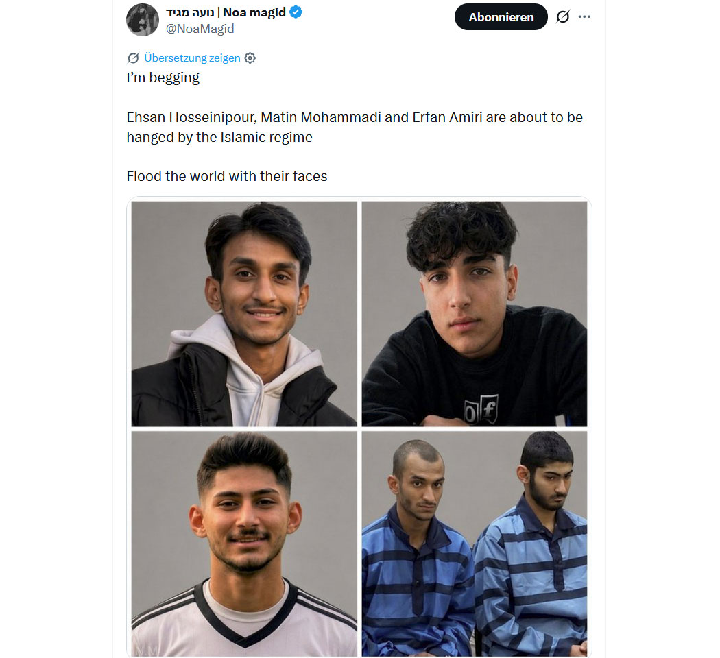 So viele junge Demonstranten für Freiheit und Demokratie im Iran werden von den Mullah-Schergen exekutiert, ermordert, gehängt - das kümmert die selbstgerechten Europäer nicht die Bohne. Die deutschen Trottel haben eh keine Zeit und Aufmerksamkeitsspanne übrig, die sind seit Wochen mit einem Scheiss-Wal beschäftigt.