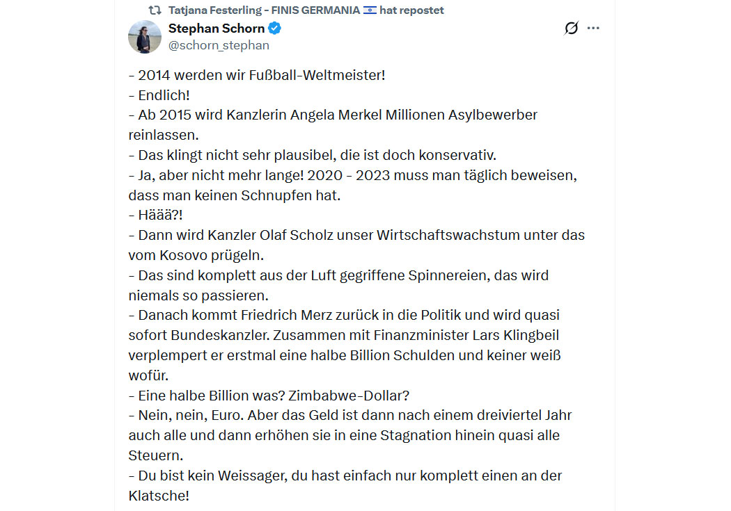Ach was, der frühere Blackrock-Frühstücksdirektor hat das alles voll im Griff. Jetzt nochmal fix ne Rede schwingen und was von Triple-Turbo-Booster für "unser Land" quasseln, dann wird das schon. Die Deutschen glauben ja sowieso alles, was der Fernseher labert - sonst wären sie ja nicht in der erbärmlichen Abwärtsspirale in Richtung Shithole.