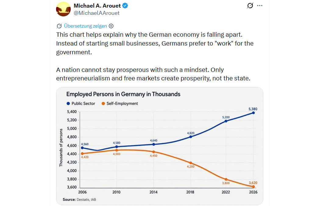 Insofern ist die "suizidale Empathie" (Gad Saad) nicht nur ein Phänomen des links-woken Westens, sondern auch auf der angeblich freiheitsliebenden, rechtsliberalen Seite zu erkennen. Sich daraus zu befreien, ist die eigentliche Aufgabe - und das geht ja nur in freien Gesellschaften, in Deutschland und der EU landet man für solche Bestrebungen im Bau oder im Umerziehungslager. Schade eigentlich.