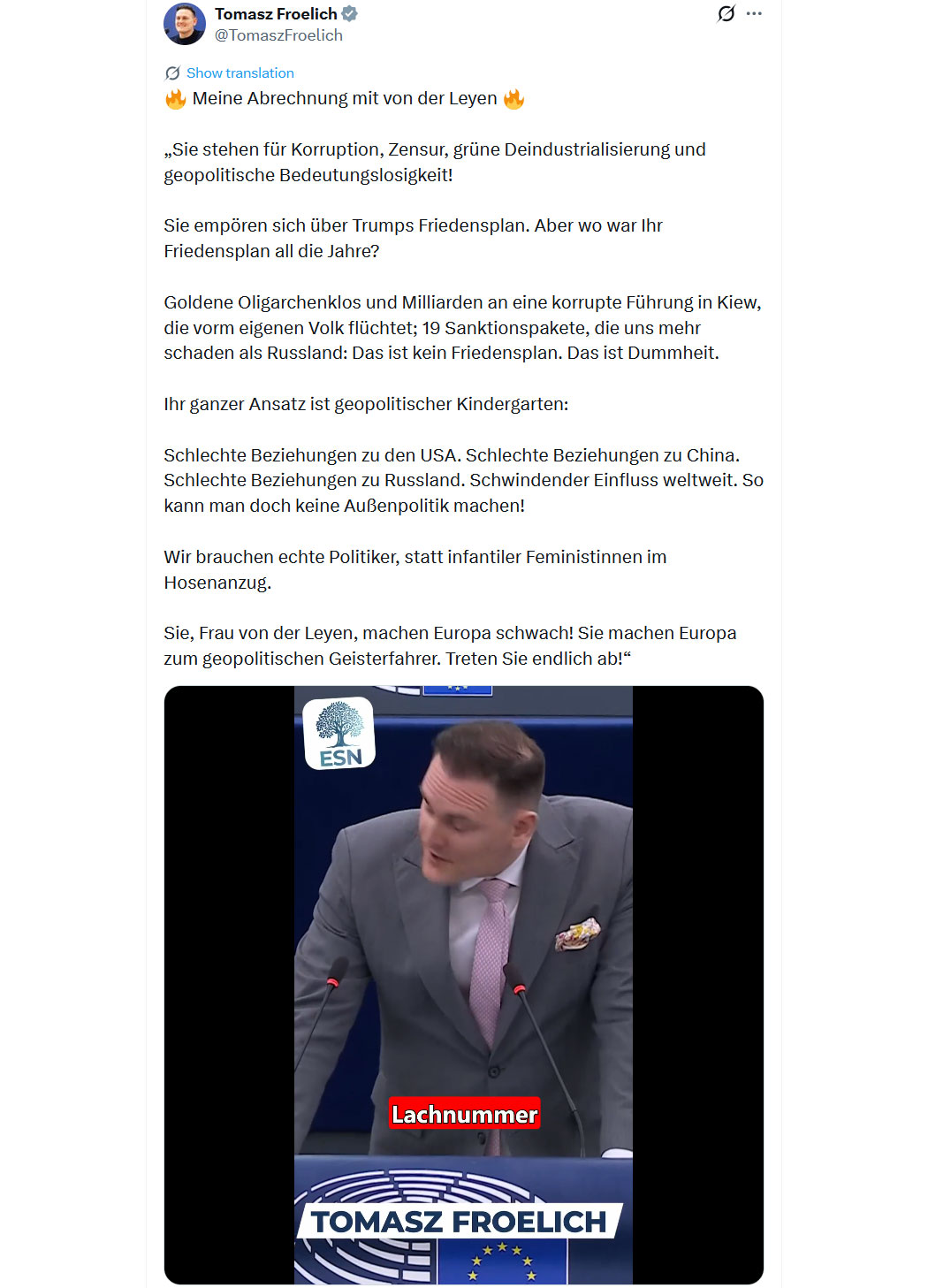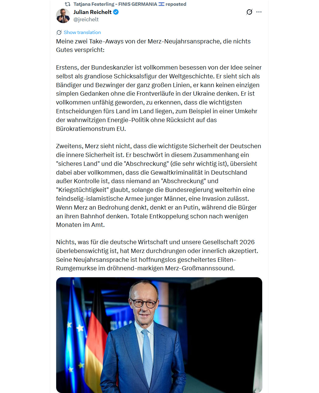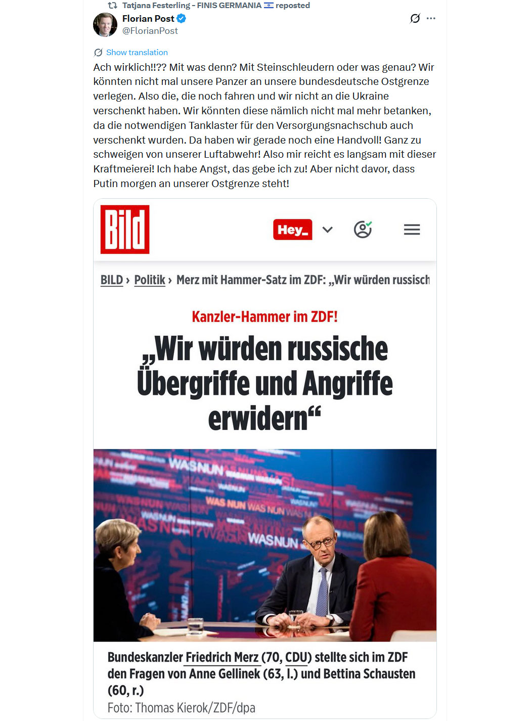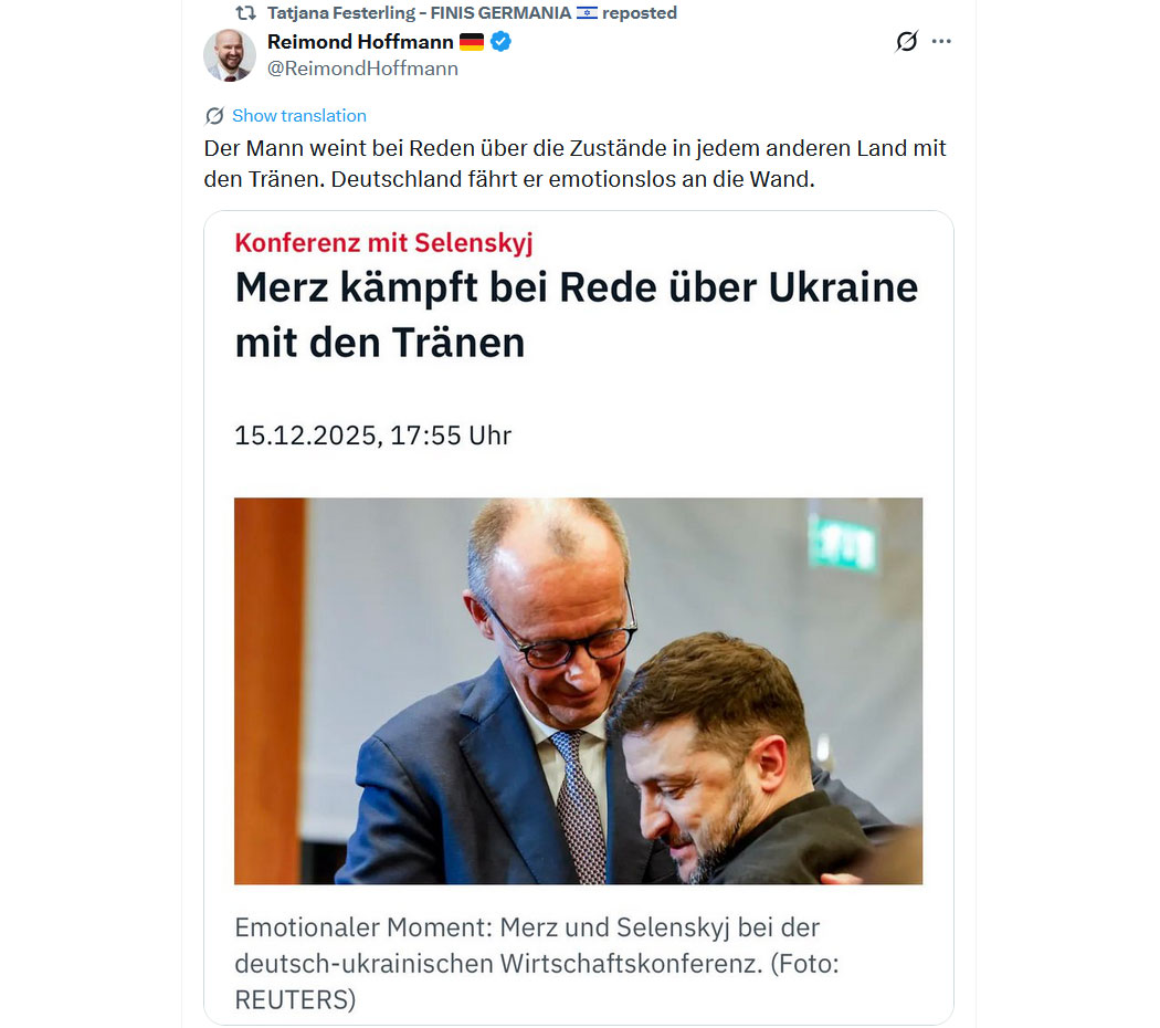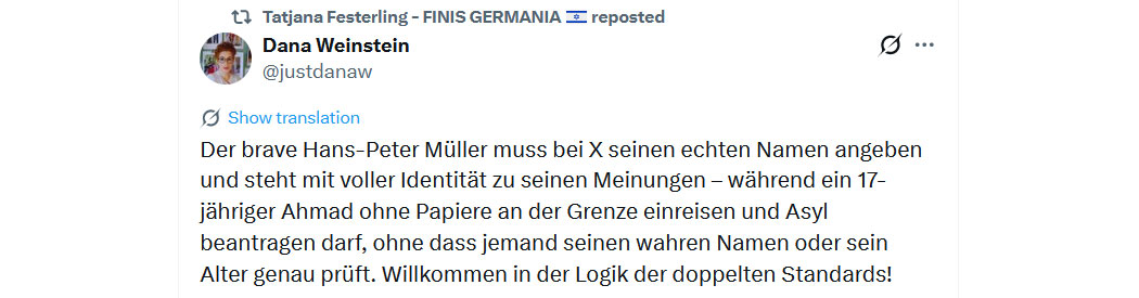 "Die Deutschen 🇩🇪 sind nicht verantwortlich für das, was sie während des Zweiten Weltkriegs getan haben, sie sind nicht verantwortlich für das, was sie 2015 getan haben, und sie werden nicht für die nächste Zerstörung Europas verantwortlich sein, die sie begehen werden.