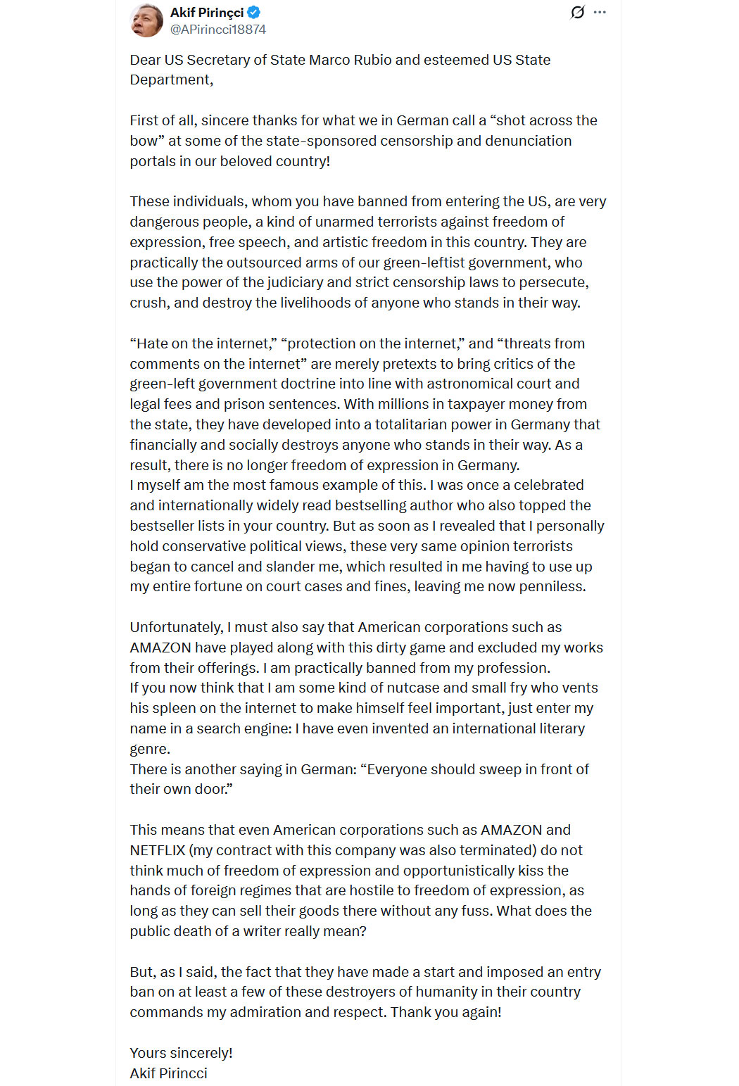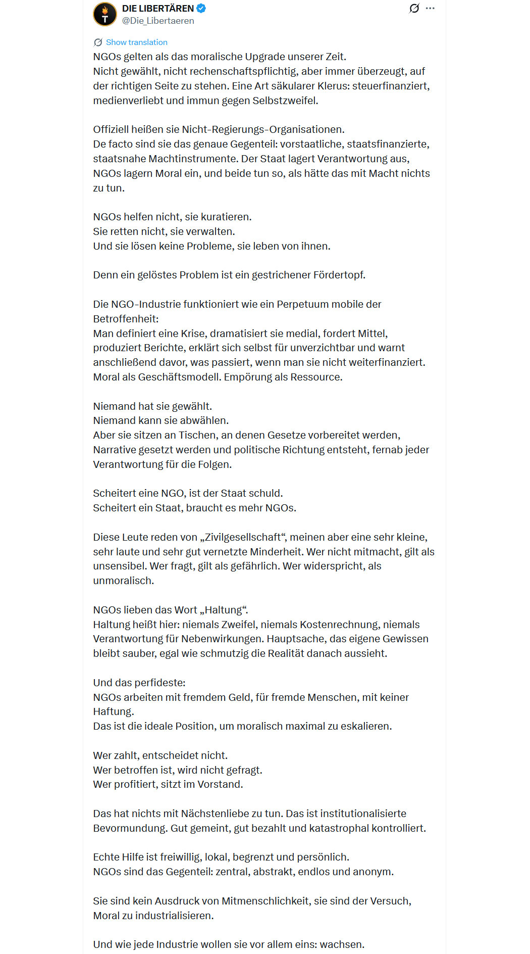 Beeindruckend! Ein Unternehmer, der sich von der faschistoiden Allianz aus linksextremen NGOs, Politikern und Medien nicht moralisch erpressen lässt. Dabei vertritt er "nur" Dinge, die in einer Demokratie selbstverständlich sind - Dialog mit allen Meinungsvertretern. Aber die Angriffe auf ihn zeigen, dass es in Deutschland schon lange nicht mehr demokratisch zugeht, sondern das Land und seine Bürger unter der Knute einer totalitären, linken Parteiendiktatur stehen, die auch noch den letzten Cent aus den wenigen, verbliebenen Steuersklaven pressen und sie einem Krieg preisgeben wollen.
