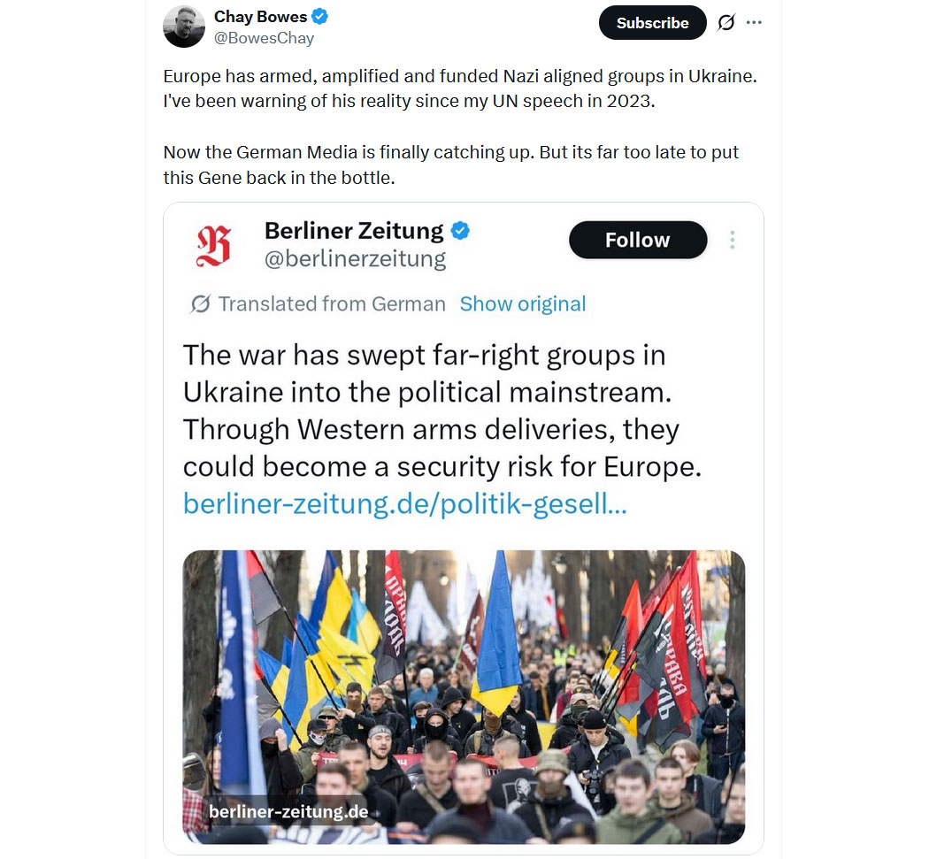 "Europa hat nazifreundliche Gruppen in der Ukraine bewaffnet, gestärkt und finanziert. Seit meiner Rede vor den Vereinten Nationen im Jahr 2023 warne ich vor dieser Realität.