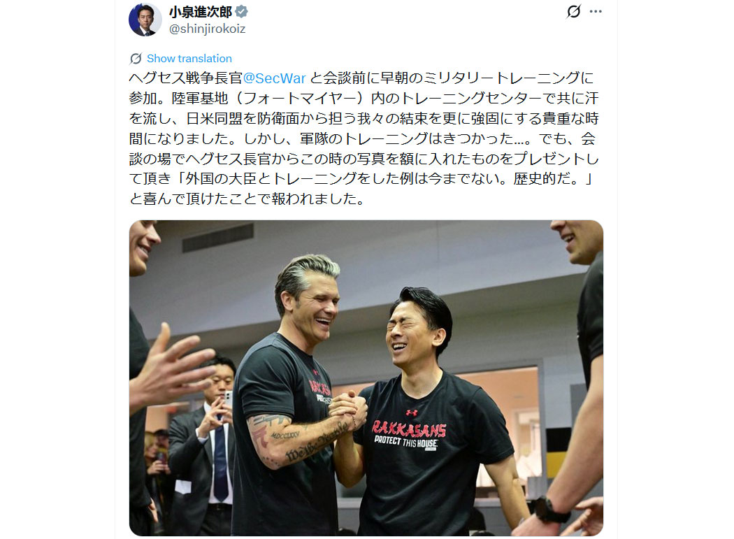 "Ich nahm am frühen Morgen an einem Militärtraining mit Kriegsminister Hegses teil. @SecWar Vor unserem Treffen verausgabten wir uns gemeinsam im Trainingszentrum auf dem Armeestützpunkt Fort Myer. Diese Zeit war eine wertvolle Erfahrung, die unsere Bindung als Verfechter des japanisch-amerikanischen Bündnisses im Verteidigungsbereich weiter stärkte. Das Training war allerdings anstrengend. Doch es hatte sich gelohnt, als mir Minister Hegses beim Treffen ein gerahmtes Foto davon überreichte und seine Freude darüber ausdrückte: „So etwas hat es noch nie gegeben: ein gemeinsames Training mit einem Außenminister. Das ist historisch.“