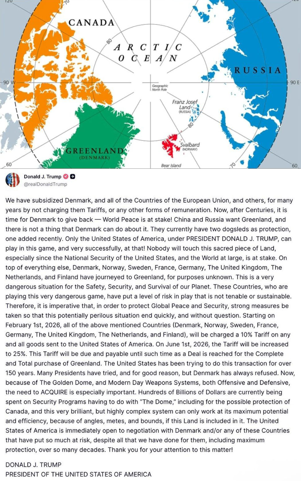 Weil sie Soldaten nach Grönland schicken, kündigt Trump in einem Posting auf Truth Social an, 10% Zoll auf Importe aus Dänemark, Deutschland, Frankreich, Großbritannien, Schweden, Finnland, Norwegen und den Niederlanden zu erheben, gültig ab dem 1. Februar 2026.