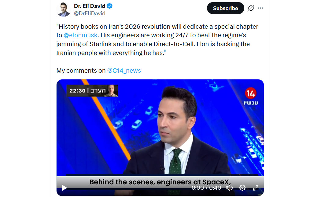 "Geschichtsbücher über die Revolution im Iran 2026 werden @elonmusk ein besonderes Kapitel widmen. Seine Ingenieure arbeiten 24/7 daran, die Störungen von Starlink durch das Regime zu beseitigen und Direct-to-Cell zu ermöglichen. Elon unterstützt das iranische Volk mit allem, was er hat."