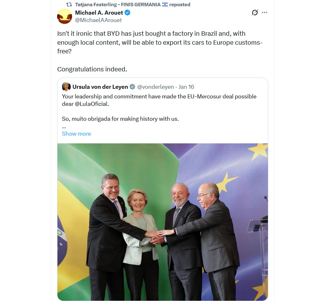 "Ist es nicht Ironie, dass BYD gerade eine Fabrik in Brasilien gekauft hat und mit genügend lokalen Inhalten seine Autos zollfrei nach Europa exportieren kann?