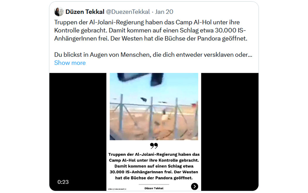 "Ohne die Kurden hätte der IS die Straßen von Berlin und London erreicht. Sie kämpften für uns alle, während die Welt aus sicherer Entfernung zusah. Jetzt werden sie aus ihrem eigenen Land ausgelöscht. Die Welt wird es bereuen, dass die Türkei die Kurden in Syrien zerschlagen hat. Die Welt wird es bereuen, Syrien dem türkischen islamistischen Regime übergeben zu haben.