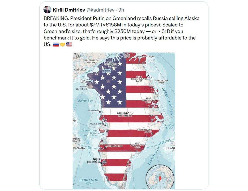 "Eilmeldung: Präsident Putin erinnert an den Verkauf Alaskas an die USA für rund 7 Millionen US-Dollar (umgerechnet heute etwa 158 Millionen Euro). Umgerechnet auf die Größe Grönlands entspräche das heute etwa 250 Millionen US-Dollar – oder, wenn man den Wert mit Gold vergleicht, rund 1 Milliarde US-Dollar. Er meint, dieser Preis sei für die USA wahrscheinlich erschwinglich. 🇷🇺🤝🇺🇸"