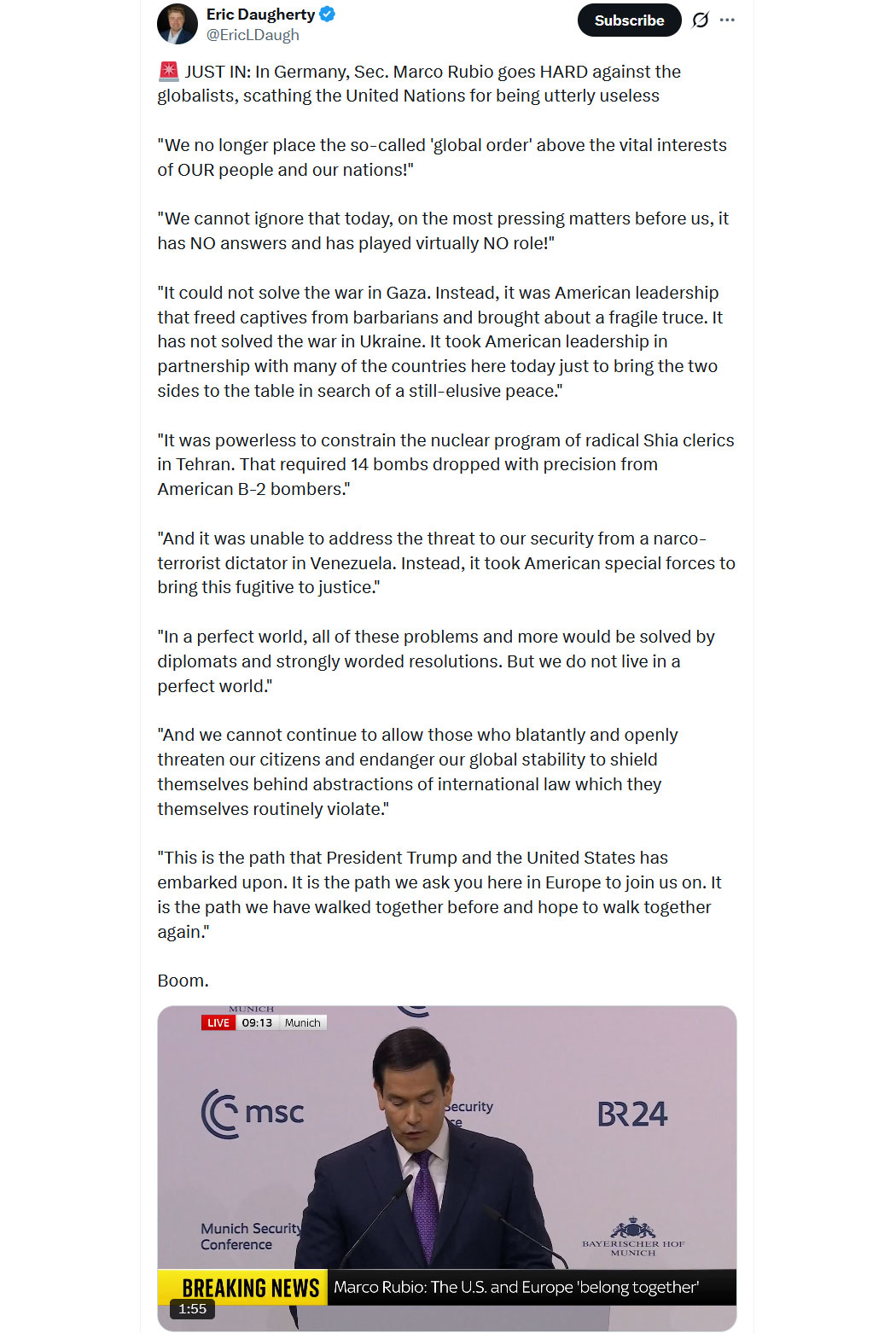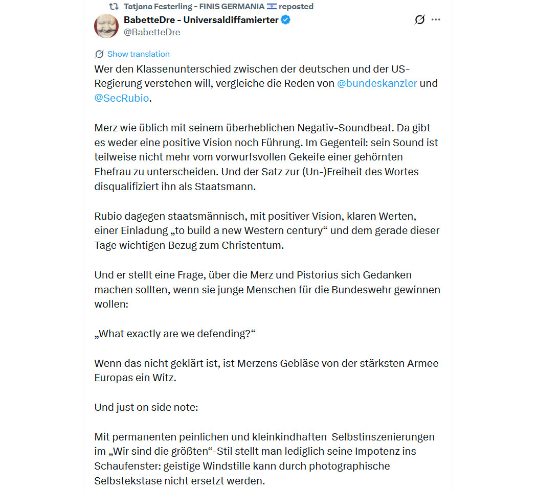 Eine großartige, intelligente Rede von @SecRubio in München! Nur leider werden sie die europäischen Verantwortlichen in ihrer Ignoranz und Selbstgefälligkeit nicht verstehen, denn sie sind rrrrrretarded.
