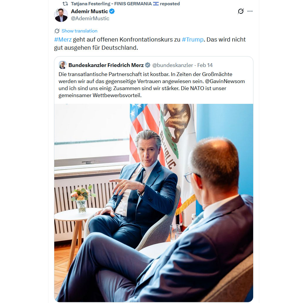 Merz hofft wohl darauf, dass Newsom der nächste US-Präsident wird und er dann endlich zu seiner "Führungsrolle" für Europa kommt, wo er es sich mit @realDonaldTrump, @JDVance und @SecRubio total verscherzt hat. Im Casino nennt man sowas wohl "Alles auf Rot". 🤡