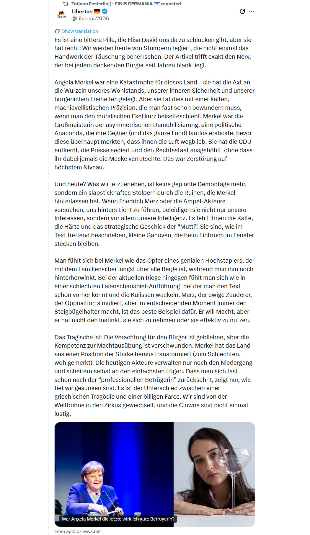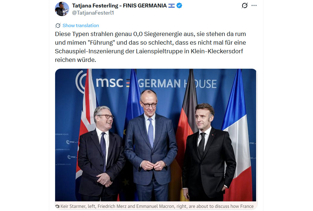 4) Merz scheint zu glauben, dass Deutschland die mächtigste Armee Europas haben wird. Deutsche junge Männer werden nicht einmal für die Verteidigung ihres eigenen Landes kämpfen. Merz hat eine Missbilligung von 78% in seinem eigenen Land."