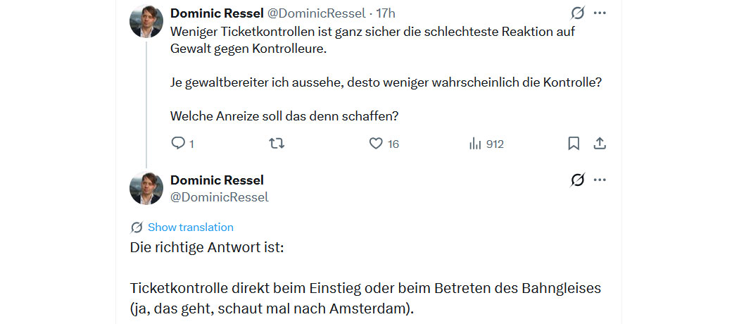 Das nennt sich geschlossenes ÖPNV System, das war übrigens eine der wichtigsten Maßnahmen, mit denen Giuliani Mitte der 80iger NYC aufgeräumt hat. Ein Zug ist ein enges Beförderungsgefäß, in dem keiner flüchten kann - es ist im heutigen Zustand in Deutschland verantwortungslos, die Gefahr der Kontrolle (und Deeskalation) komplett auf hilflose Fahrgastbetreuer und Zugbegleiter abzuwälzen. Man hätte schon längst auf geschlossene Systeme und Zugangsbeschränkungen setzen müssen, aber es war ja wichtiger, Steuer-Millionen in die nutzlose Videoüberwachungs-Mafia zu lenken.