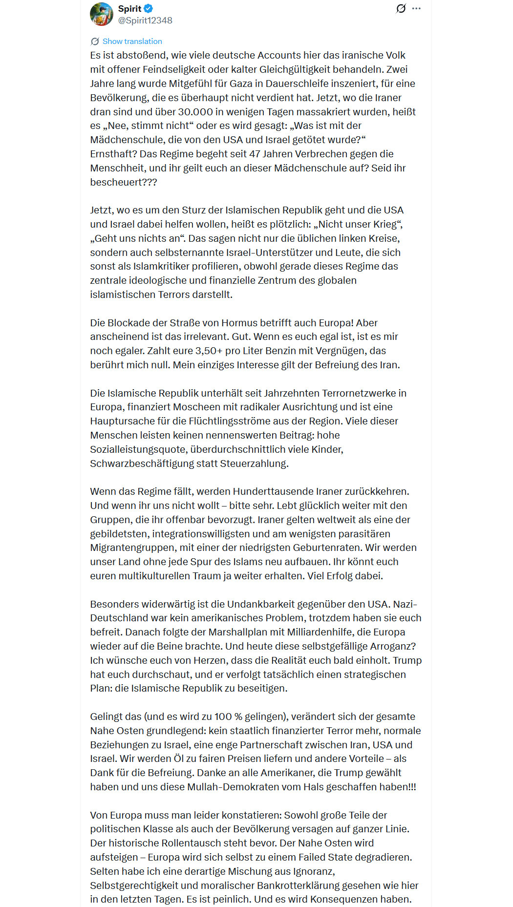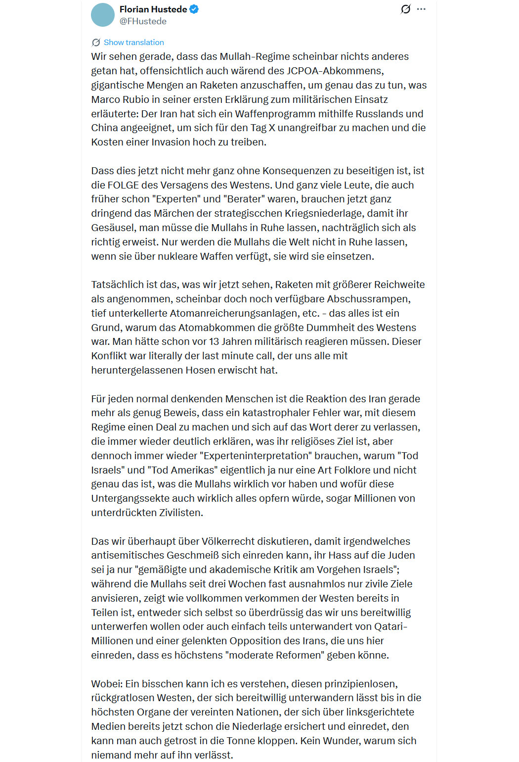 Ein großartiger Kommentar! Man ist inzwischen angewidert von dem Appeasement und den feigen, billigen Rechtfertigungen für das Mullah-Regime durch sogenannte "Demokraten" und Durchblicker. All das Freiheits- und Menschenrechtsgeschwätz, das natürlich nur selektiv angewendet wird und weder für Perser noch Israelis noch die in Fetzen vergewaltigten Mädchen im eigenen Land gilt - diese feige Bösartigkeit gekoppelt mit hündischer Unterwerfung gegenüber einem Terror-Regime, das einem die Raketen in den Vorgarten knallen kann, ist nicht mehr zu ertragen. Die Haltung zu diesem längst überfälligen Krieg, den das mutige Israel und die mächtigen USA führen, und damit den degenerierten, feigen, leugnenden EU-Westlern ermöglichen, weiter die Hybris-Fresse aufreissen zu können, MUSS zu einer Spaltung in der Gesellschaft, am Arbeitsplatz, im Freundeskreis, in den Familien führen! Man darf nicht schweigen um irgendeines Pseudo-Friedens willen, wir befinden uns bereits in der Prä-Progrom-Zeit.