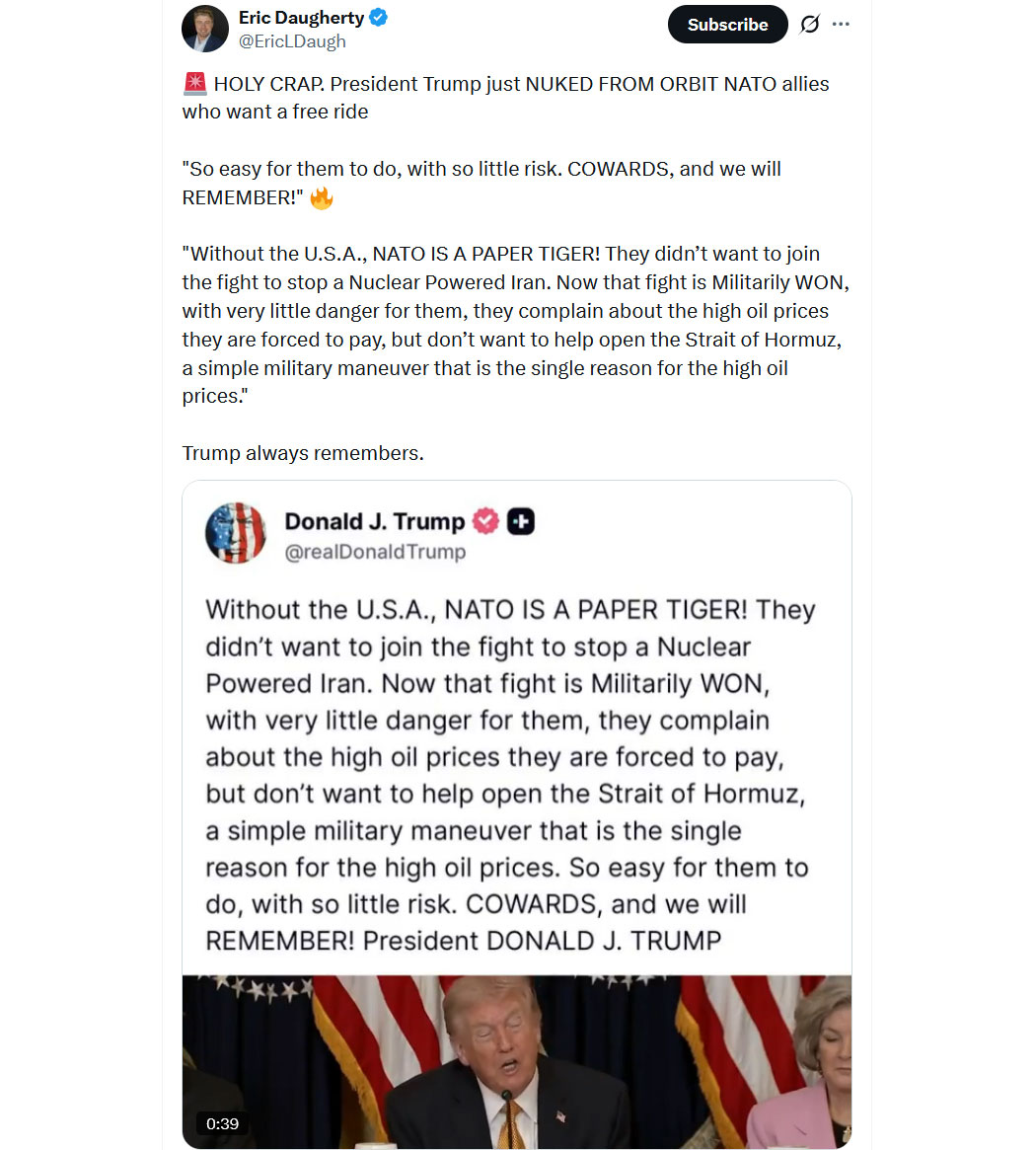 „Ohne die USA ist die NATO ein Papiertiger! Sie wollten nicht in den Kampf gegen ein atomar bewaffnetes Iran eingreifen. Jetzt, wo dieser Kampf militärisch gewonnen ist, ohne große Gefahr für sie, beschweren sie sich über die hohen Ölpreise, die sie zahlen müssen, wollen aber nicht helfen, die Straße von Hormus zu öffnen – eine simple militärische Maßnahme, die der einzige Grund für die hohen Ölpreise ist.“