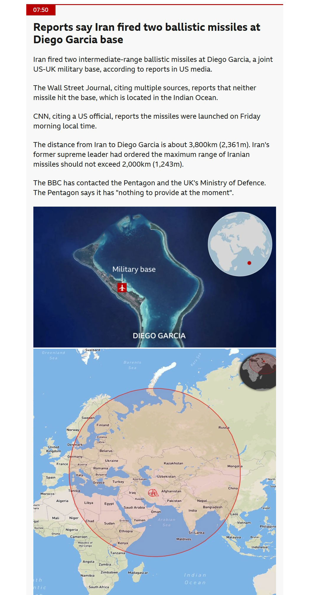 Der US-amerikanisch-britische Militärstützpunkt auf Diego Garcia liegt etwa 3.800 km von Teheran, Iran, entfernt (verschiedene Berichte geben die Entfernung zwischen ca. 3.795 km und ca. 4.000 km an; in der jüngsten Berichterstattung über den Vorfall wird üblicherweise eine Entfernung von ca. 4.000 km verwendet).