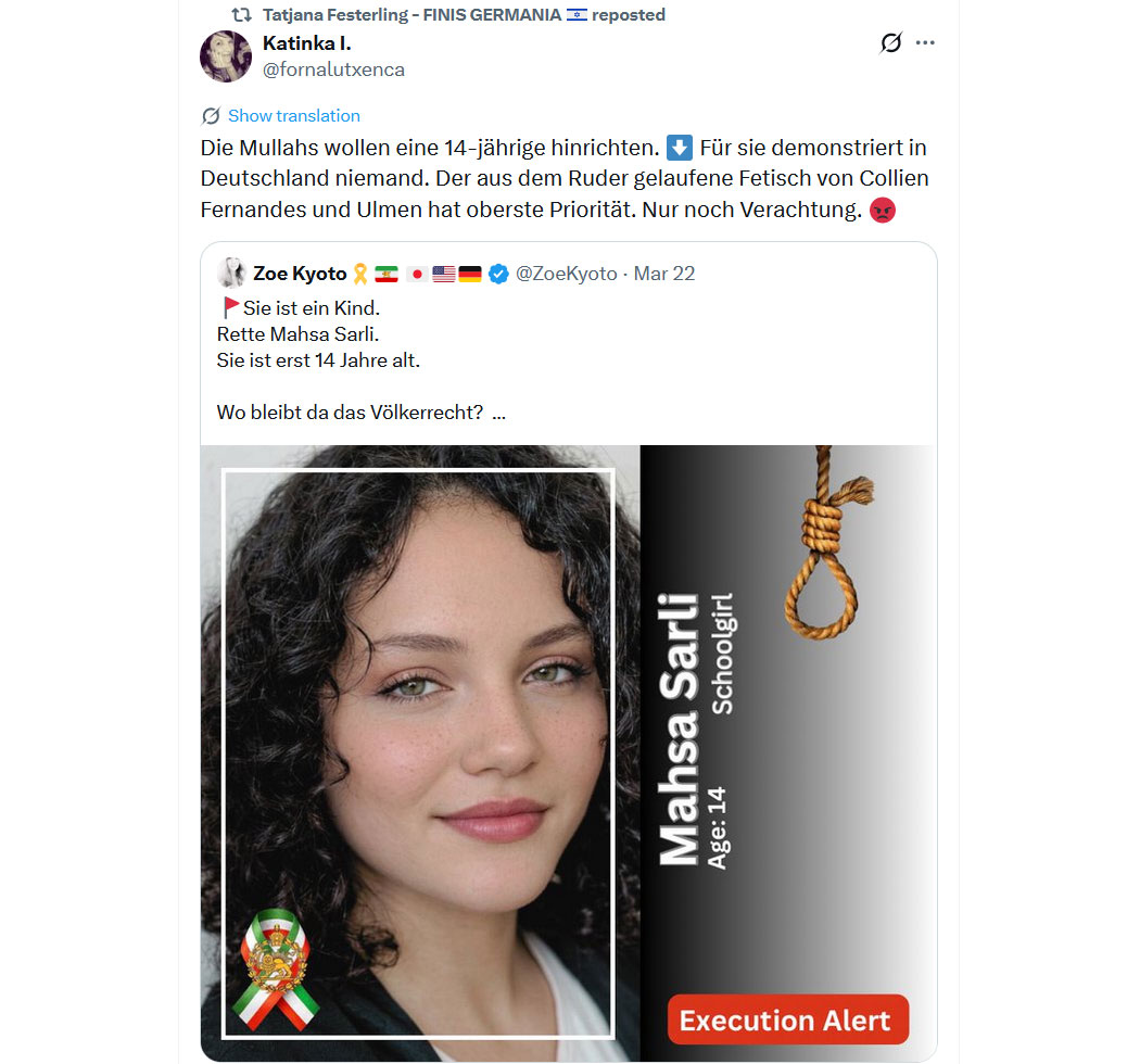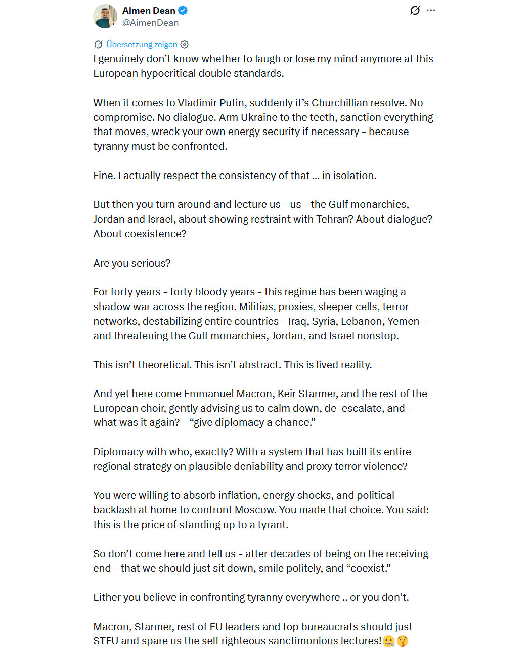"Krieg gegen den Iran" - ich glaub es hackt! Die Alice will also, dass die Menschen im Iran vom Mullah-Terrorregime weiter unterdrückt, geknechtet und gefoltert werden und Israel angesichts der Gefahr seiner Auslöschung still hält? Frau Weidel gesteht damit ein, dass Deutschland seine Grenzen nicht vor dem zu erwartenden Ansturm von Regime-Islamisten schützen kann und sie keinen Fokus auf Innenpolitik richtet? Wie widerlich ist das? Das ist nicht Politik, das ist feiges Duckmäusertum eines Schwächlings auf Kosten von Millionen Menschen! Gleichzeitig fällt diese Politik-Darstellerin ihren angeblich so guten Kontakten der Trump-Administration in den Rücken. Es dient nur einem Zweck: Kurz vor wichtigen Wahlen der CDU Wahlkampfunterstützung zu liefern. Wer sind Sie - @Alice_Weidel ??