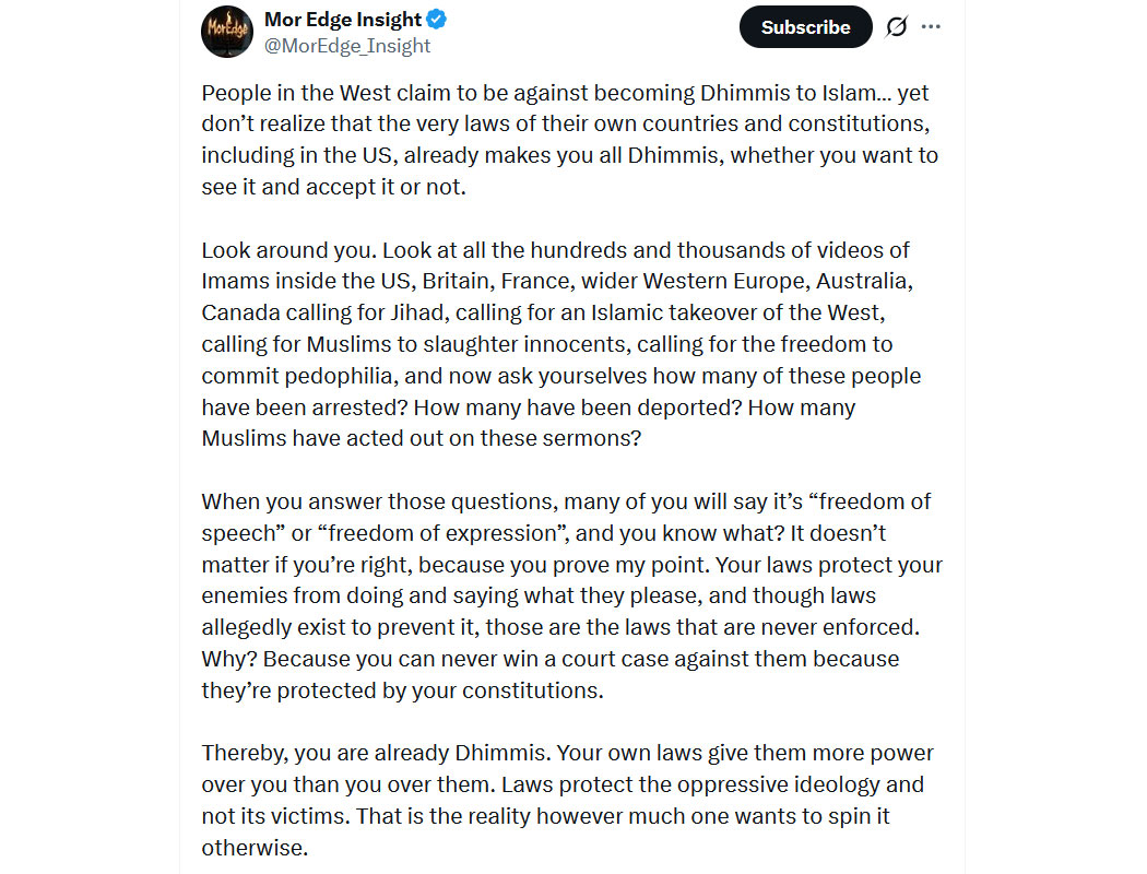 Dadurch seid ihr bereits Dhimmis. Deine eigenen Gesetze geben ihnen mehr Macht über dich als du über sie. Gesetze schützen die unterdrückende Ideologie und nicht ihre Opfer. Das ist die Realität, wie sehr man es auch anders drehen möchte."