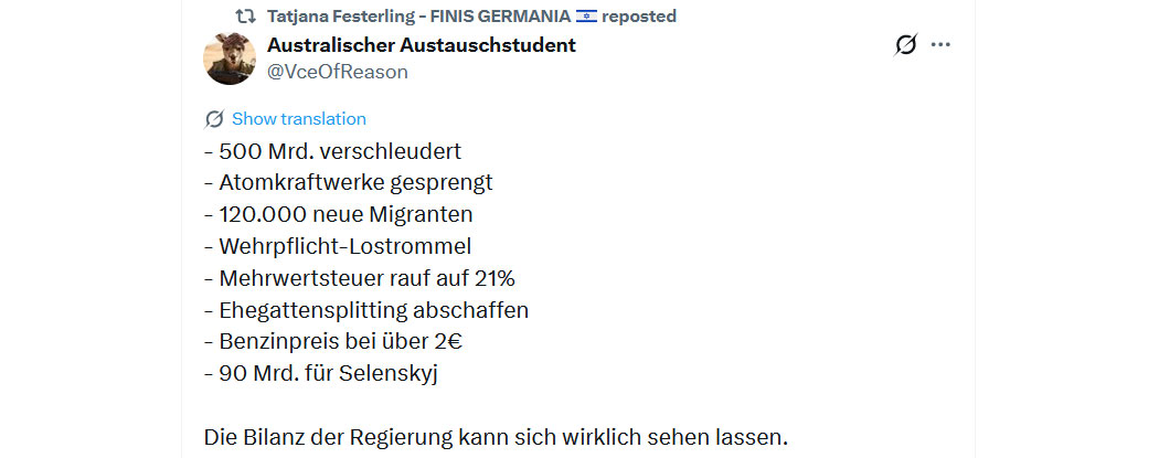 Ich bin erschüttert darüber wie dermaßen dumm, dreist, narzisstisch und triggerbar das rechte Spektrum in Deutschland ist. Hilfe, ist das schrecklich! Man kann denen, die über Intelligenz und klaren Verstand verfügen, nur raten, schnellstens das Weite zu suchen.