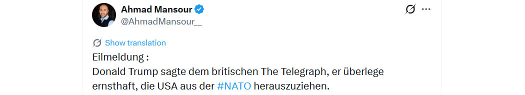 Nichts weiter als die Nordamerikanische Tributorganisation … in der die Vereinigten Staaten über 65 Prozent der tatsächlichen Ausgaben des Bündnisses tragen, während Ihre Streitkräfte zu leeren Hüllen verkümmert sind – unterfinanziert, unterbesetzt und mit veralteter Ausrüstung ausgestattet, weil Sie sich für Wohlfahrtsstaaten und grüne Symbolpolitik anstelle von Stahl und Entschlossenheit entschieden haben.