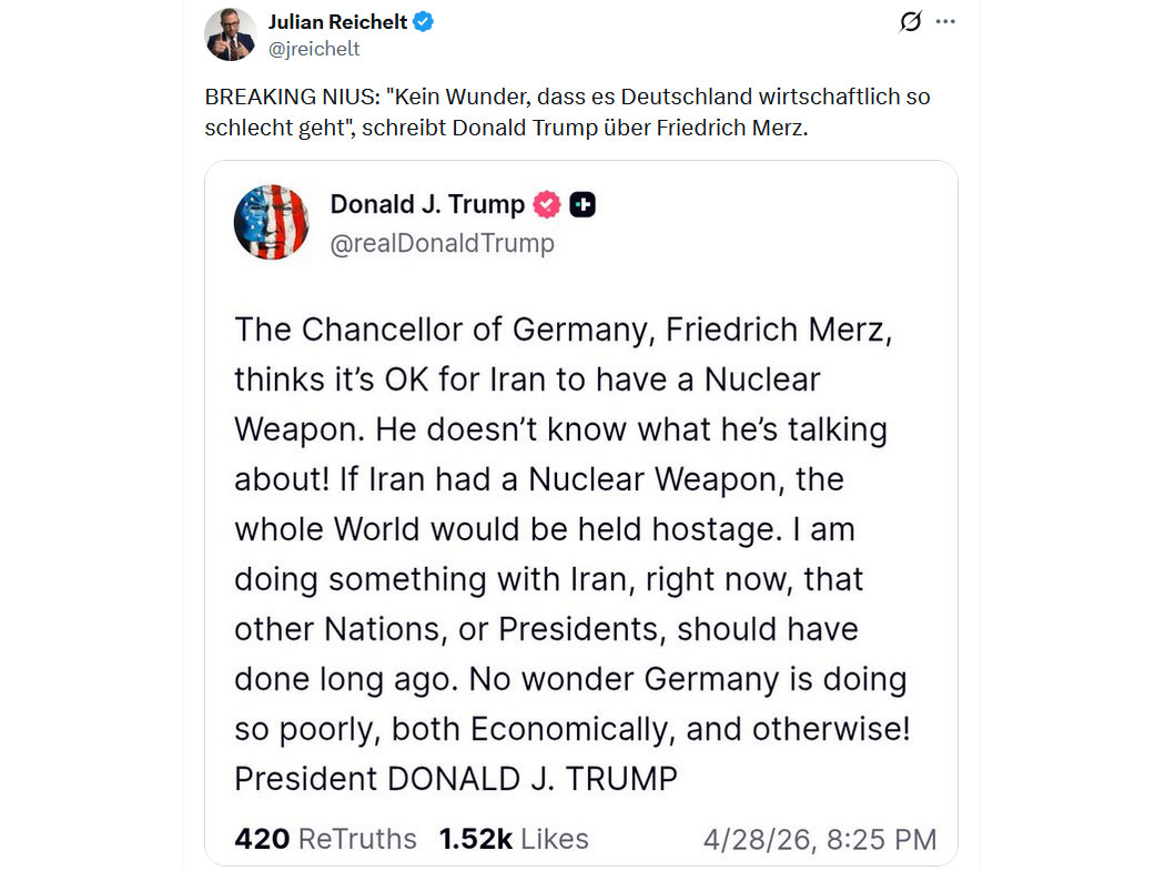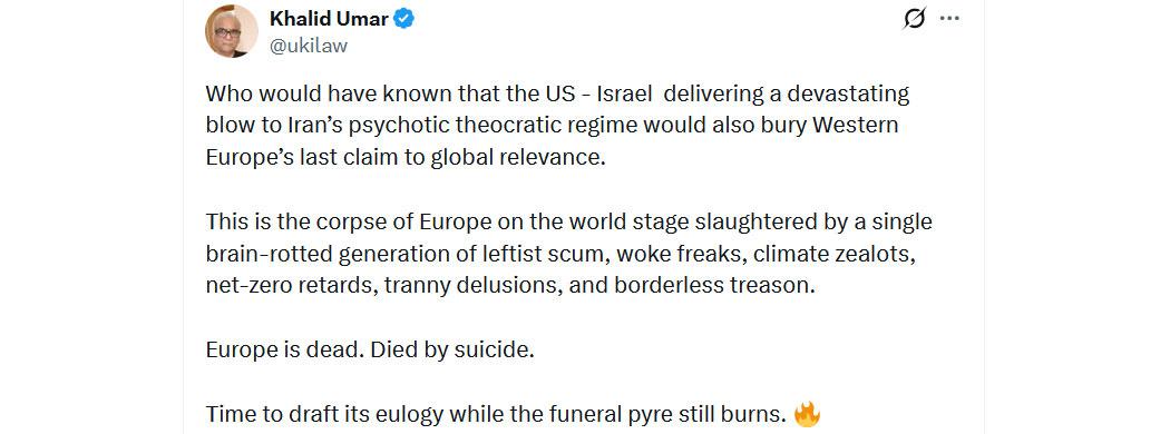 "Wer hätte gedacht, dass die USA - Israel, die dem psychotischen theokratischen Regime des Iran einen verheerenden Schlag versetzen, auch den letzten Anspruch Westeuropas auf globale Relevanz begraben würden.