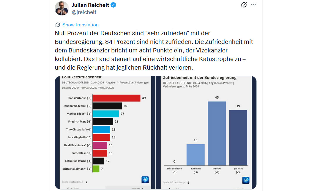 Na das ist ja mal ne Aussage. Kratzt die natürlich nicht, machen weiter und werden nicht umsteuern. Diese Regierung hat jede Legitimation verloren, aber die Brandmauer geschützte Parteiendiktatur wird die Zerstörung Deutschlands unbeirrt fortführen.