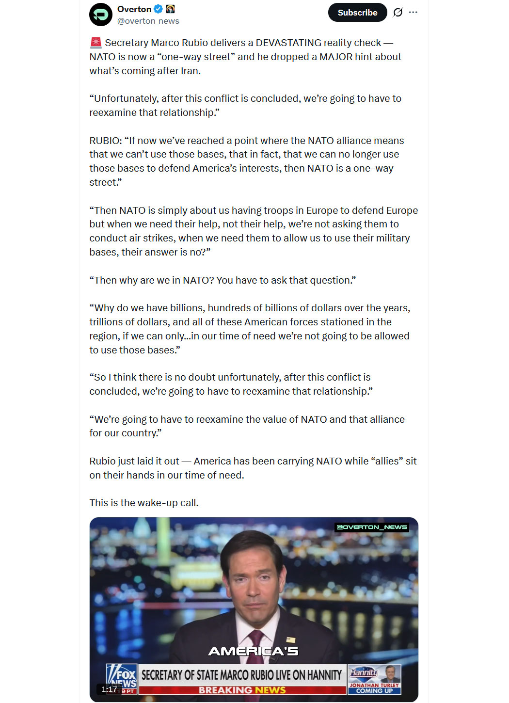 Rubio wieder einmal in frappierender Klarheit über die Einbahnstraße NATO. In ganz West-Europa ist nicht EIN Politiker zu sehen, der auch nur annähernd an die Klasse der Jungs um Trump herankommt. Schon gar nicht in Deutschland. Die jahrzehntelange Negativauslese in der Politik hat dafür gesorgt, dass nur noch dümmliche, fanatische und korrupte Kretins an den Machthebeln im Staat sitzen und statt zu liefern nun vor den Augen der Welt versagen.