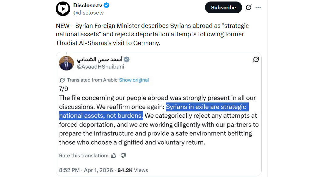 "NEU - Der syrische Außenminister bezeichnet Syrer im Ausland als "strategisches nationales Vermögen" und lehnt Abschiebeversuche nach dem Besuch des ehemaligen Dschihadisten Al-Sharaa in Deutschland ab."