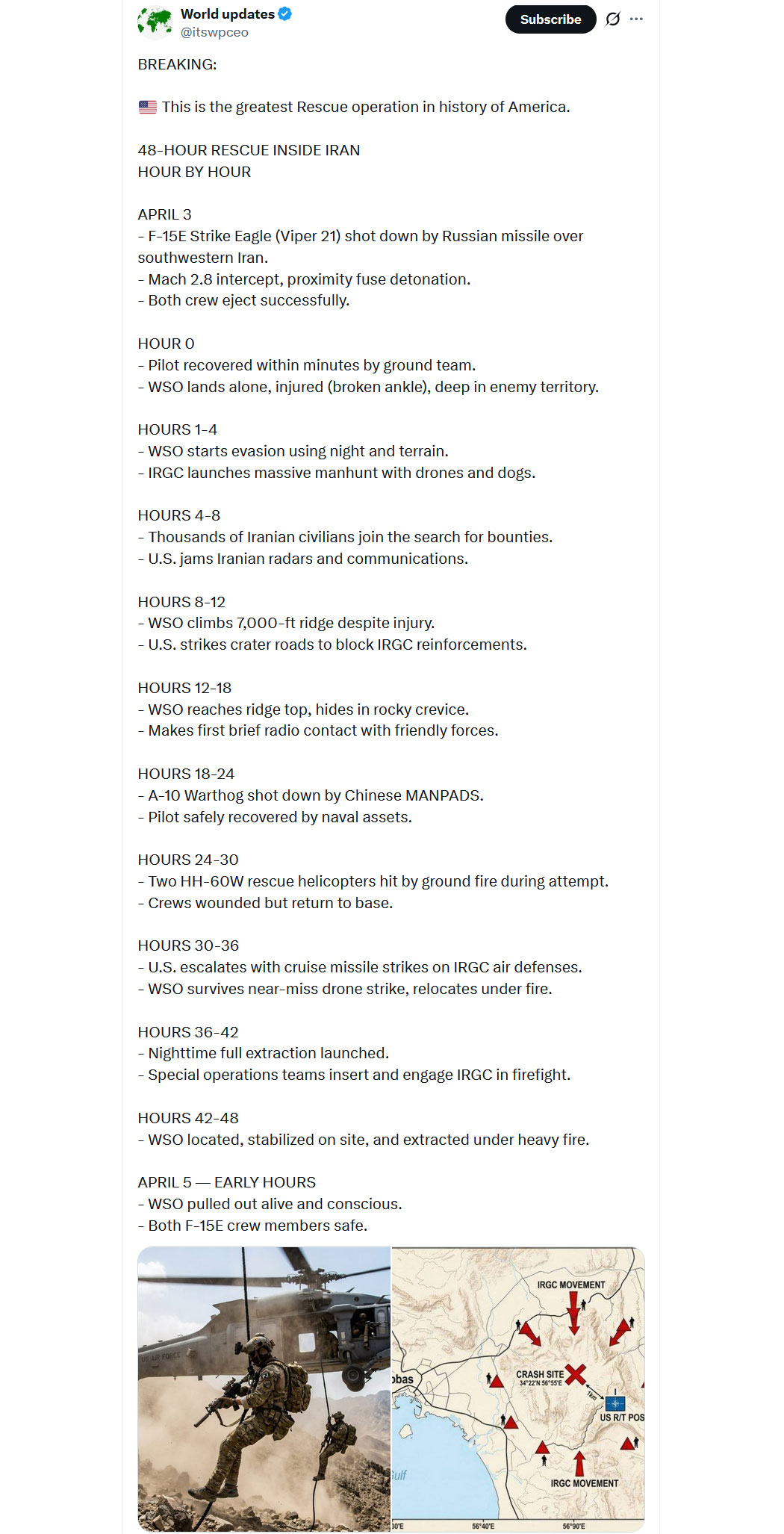 - Eine F-15E Strike Eagle (Viper 21) wurde über dem Südwesten Irans von einer russischen Rakete abgeschossen.