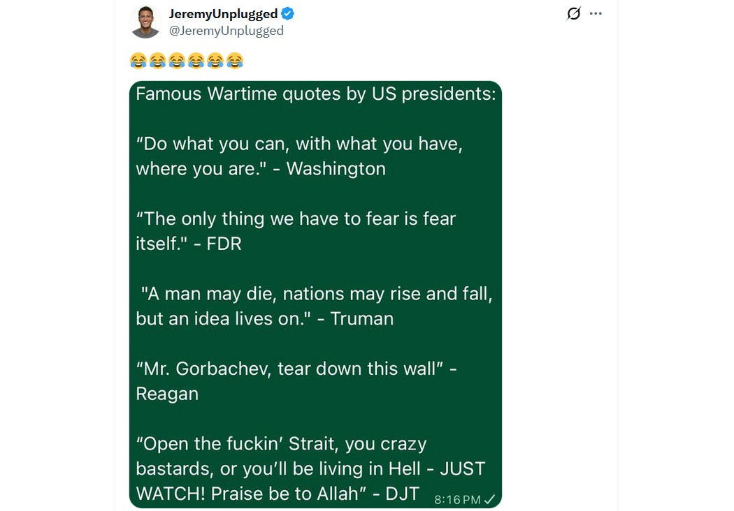 Arrogante Tweets wie dieser und natürlich die dümmlichen Äußerungen west-europäischer Politiker und verarmter, deutscher Sofa-Schwatz-Strategen (die in schönster deutscher Hybris verkünden, die Amerikaner hätten gar keine Strategie), sorgen dafür, dass uns der Rest der Welt nicht nur nicht mehr respektiert, sondern uns Europäer #Europoor und #Eurotrash nennt. Leider zu Recht.