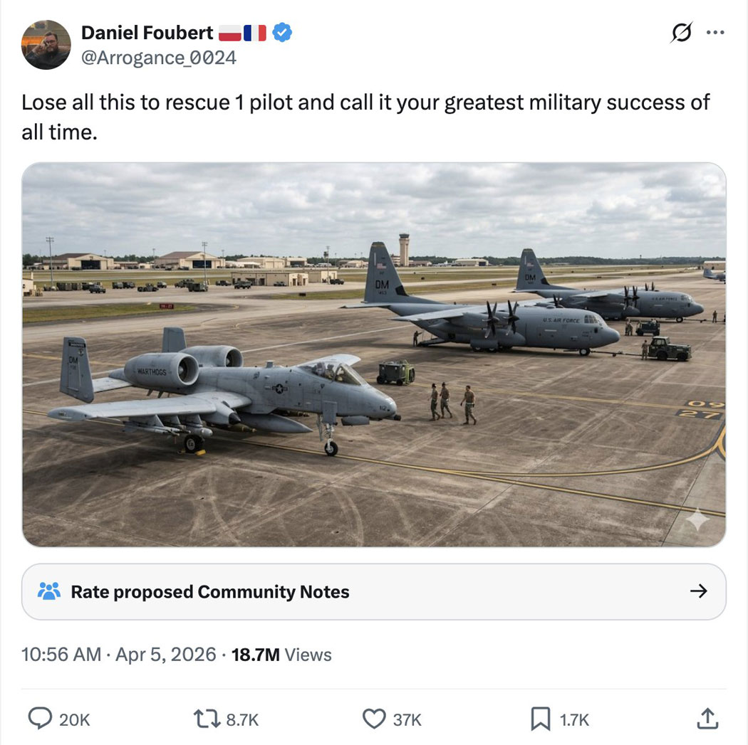 Während man sich in Deutschland an der Brandmauer aufgeilt und für die Mullahs demonstriert, kämpfen Israel und die USA für ein freies Persien, fliegen zum Mond und ziehen eine militärische Rettungsaktion durch, die später als Verfilmung ein Blockbuster wie "American Sniper" werden wird. Was für ein Unterschied zu den zahn- und eierlosen, schwatzenden Europäern!
