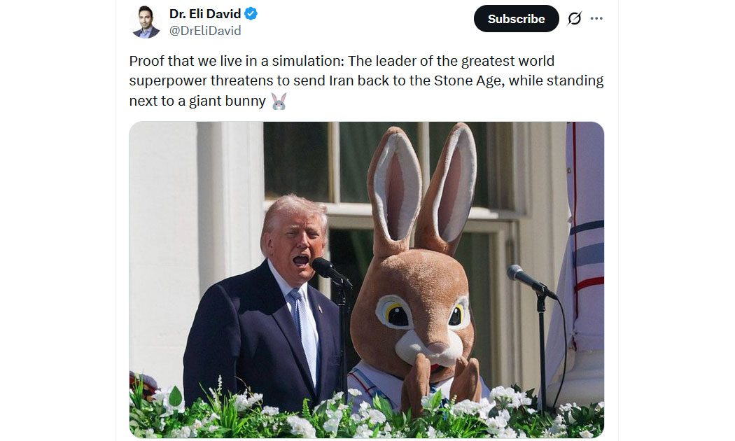 😂 Das Skurile dieses Augenblicks ist genial - was Trump sagt, bleibt hängen, der absurde Bunny dient dabei als Anker. Und es ist auch demütigend für die noch vom Sieg phantasierenden Mullahs - Trump kündigt an, das iranische Regime in die Steinzeit zu bomben - nicht etwa im gediegenen Rahmen, sondern mit einem gigantischen Plüschhasen an der Seite.