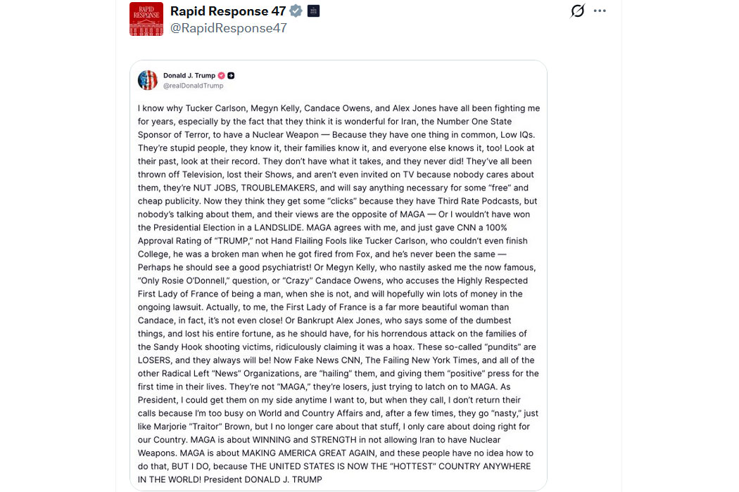 Finally! Endlich spricht Trump ein Machtwort und weist den irren, narzisstischen Zersetzern und antisemitischen Mullah-Fans der MAGA Bewegung von Candy bis Tucker den Platz zu!