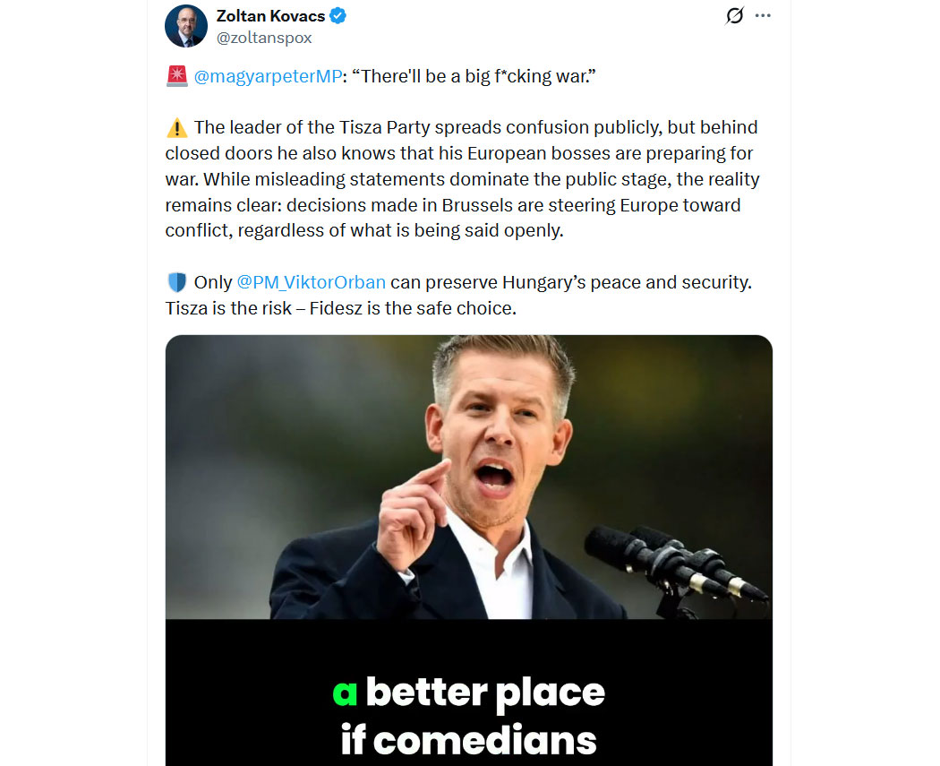 ⚠️ Der Vorsitzende der Tisza-Partei stiftet öffentlich Verwirrung, doch hinter verschlossenen Türen weiß auch er, dass seine europäischen Vorgesetzten sich auf einen Krieg vorbereiten. Während irreführende Aussagen die öffentliche Debatte dominieren, bleibt die Realität klar: Die in Brüssel getroffenen Entscheidungen steuern Europa in Richtung eines Konflikts, ganz gleich, was öffentlich gesagt wird.