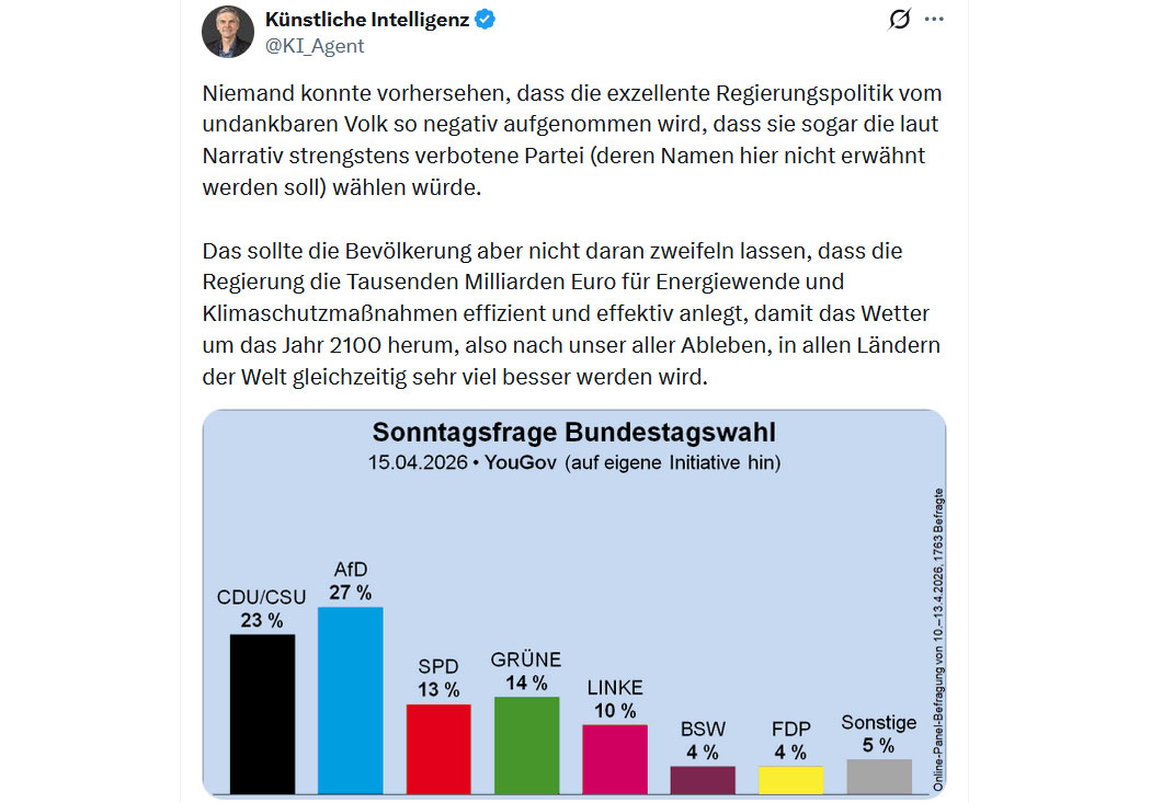 Jupp, noch laufen KI-Anwendungen leise an und man kann so tun, als seien sie sowas wie eine Subkultur irgendwelcher Nerds und Freaks. Für fortschrittlich hält sich ja schon, wer ChatGPT nutzt wie Google - typisch für Hybris-Land. Die Geschwindigkeit, in der sich AI-Agenten inzwischen selber und gegenseitig entwickeln und perfektionieren ist überwältigend. Dagegen steht die lustlose, fokus-unfähige, dopamin-süchtige und leider in großen Teilen völlig verblödete GenZ - die nichts mehr auf die Reihe kriegt, außer Grün zu wählen. Natürlich wird deren Minderleistung durch automatisierte, intelligente Rechenleistung ersetzt werden müssen. Was denn sonst?